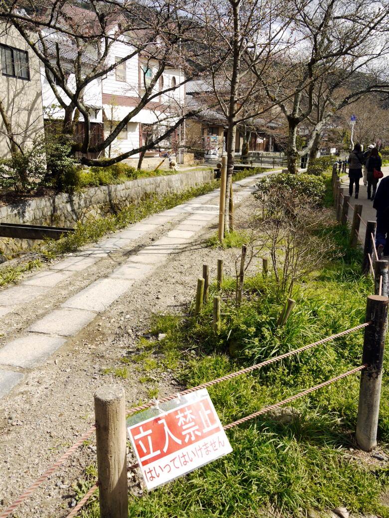 私達が訪ねたときには、桜の養生のために石畳の歩道には入れませんでしたが、桜並木の遊歩道は風情があり、いつも大勢の観光客で賑わっています。