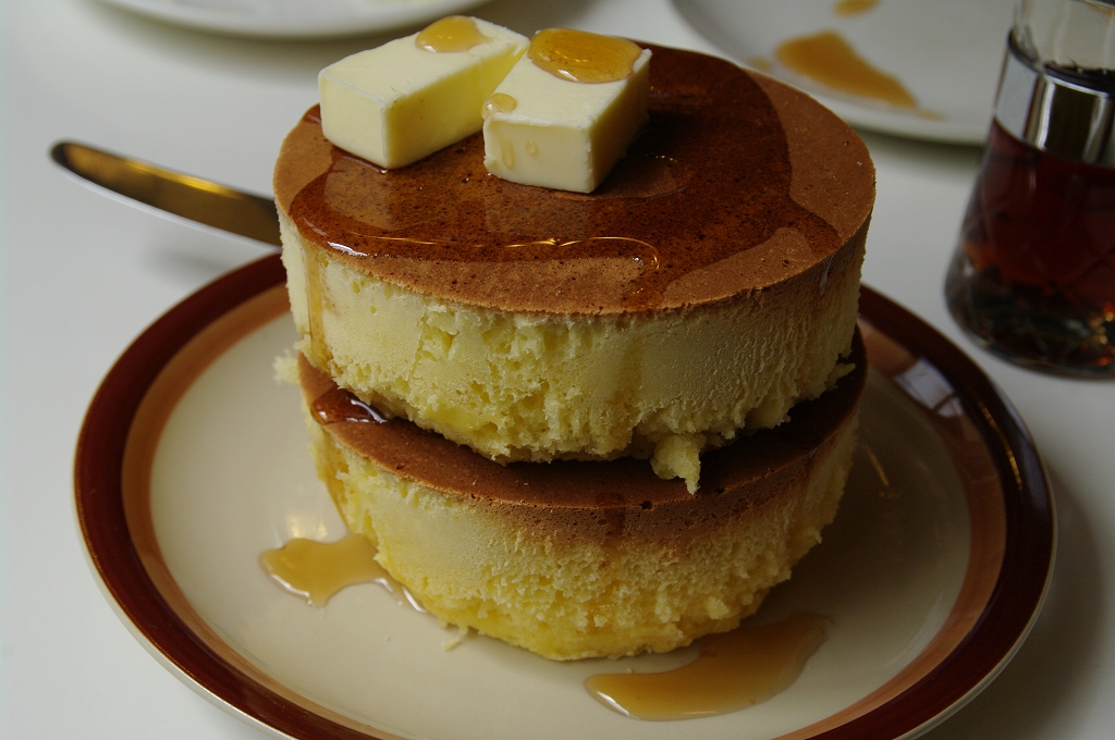 鎌倉駅から2分小町通りの入口すぐのところにある老舗のコーヒー店のホットケーキは1つが5cmくらいある大きさです。中は弾力のあるふっくら、そして表面がさっくりとした触感がたまらない逸品です。だれもがとっても幸せな顔になっています。