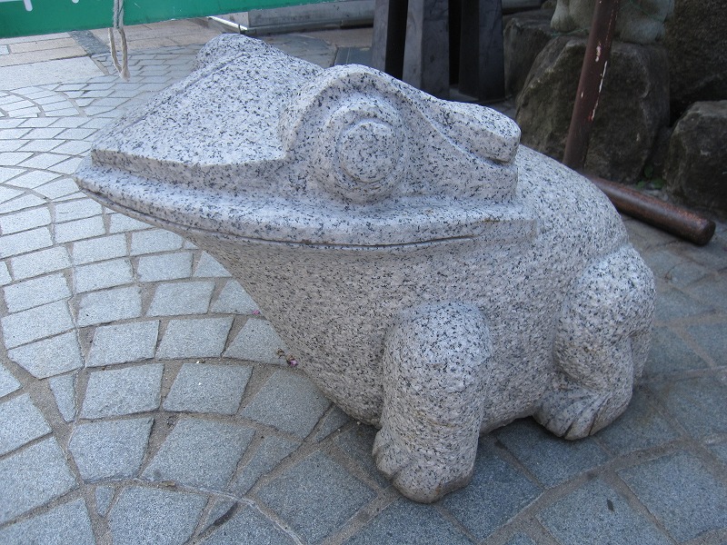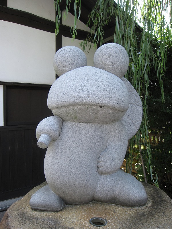 カエルをシンボルとしていて、ユーモラスなカエルの石像があります。