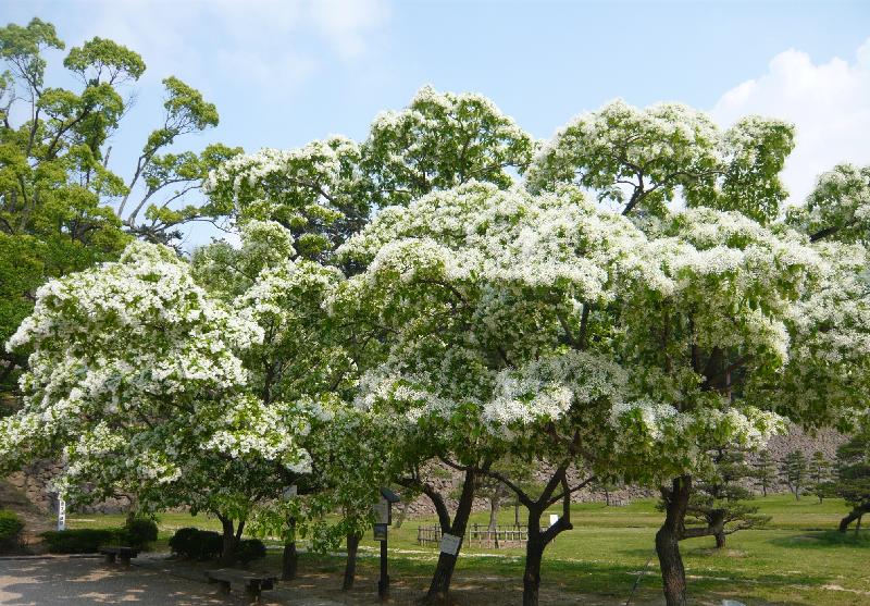今年は寒かったらしく全体的に開花が遅れているようで、例年なら連休中が見ごろだという「なんじゃもんじゃ」が満開で真っ白な花と甘い香りが感動的でした。