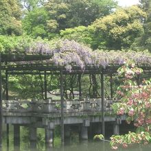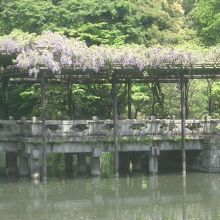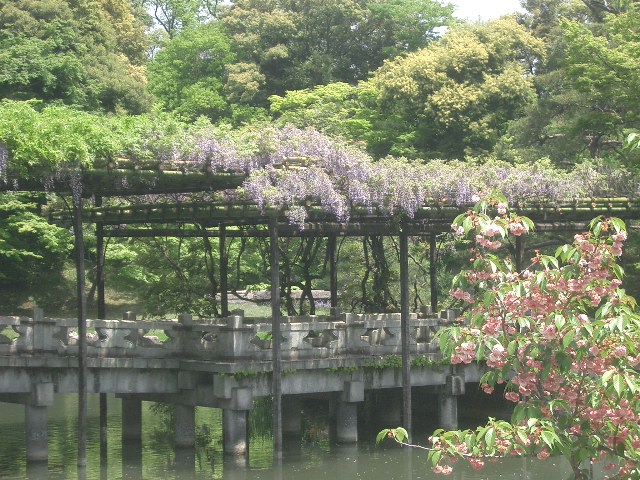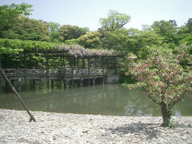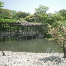 仙洞御所の南庭にかかる八つ橋。そこに藤棚があります。その季節でないと、もちろんフジは咲いていません。ここの藤棚は比較的小さなものですが、手入れは行き届いています。清楚なフジ本来の味わいが感じられます。たぶん、仙洞御所を設計した人は、この藤棚をつくりたかったから、南庭に八つ橋をかけたのでしょう。