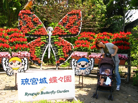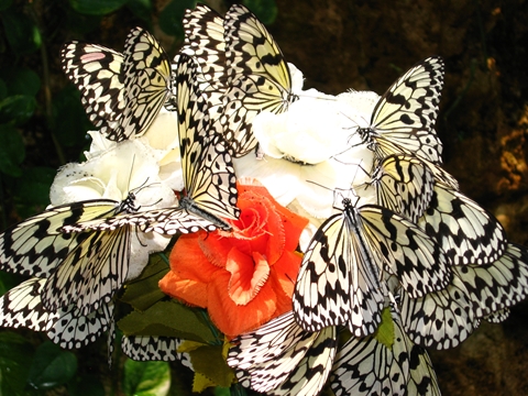 見所は蝶々ハウスというところで、オオゴマダラをはじめとした蝶々を飼っています。途中なぜか? 造花に大量のオオゴマダラが集まっています。 本物の花ではないのでなぜこんなに集まっているのだろうと、近くにいた施設のお兄さんに聞いてみました。 それによると、造花に「ポカリスエット」をしみこませているのだそうです。 そうして、偽りの花に蝶々をおびき寄せているのだと、真剣なまなざしで話され、さらに「ポカリスエットが効くのはオオゴマダラだけなんです」という情報まで教えてくれました。 また、なぜか帽子も途中においてあるのですが、これについては、「これにもポカリがしみこませてあって、皆に蝶々のついた帽子をかぶっていただこうと思いまして」とこれまた真剣なまなざしで話されていましたが、はたしてポカリで濡れた帽子をかぶりたいと思うのかどうか? 少し納得いかないところがあったのも事実です。