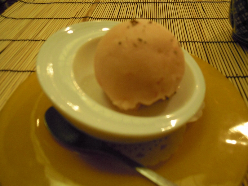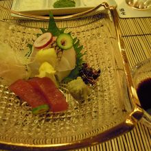 後で出るサラダも千切りにしたサツマイモを揚げた物が添えられており、