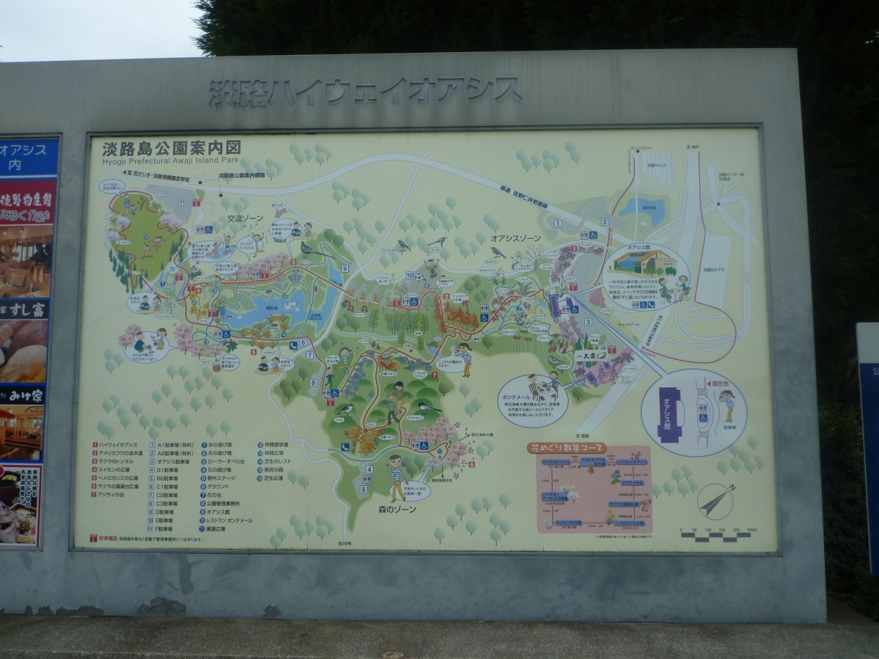 神戸方面からは、神戸淡路鳴門自動車道で明石海峡大橋を渡ってすぐの淡路サービスエリア(ハイウエイオアシス)に直結する公園ですから、アクセスは抜群! でも、橋の料金が高いからお財布には厳しい (><;)