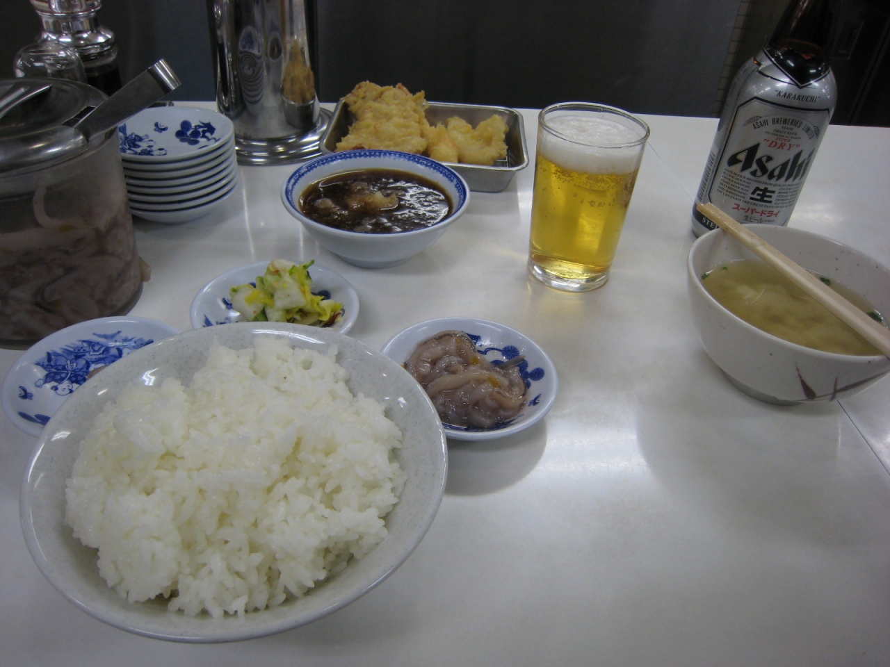 大きな道沿いとはいえ、基本辺鄙な場所ではありますが到着した際には大行列でした。食券購入のシステムですが、ほとんどの定食が1000円未満です。座るとご飯・味噌汁・天つゆが前に置かれ、食べ放題のイカの塩辛・高菜・お新香で小腹を満たします。イカの塩辛は柚子皮入っていて、風味があり美味しいです(持ち帰りように売ってもいます)。なにより職人さんが目の前で熱々でホクホクで値段考えると大きめの天ぷらを揚げて、トレイにぽんと出される幸せといったらないです。