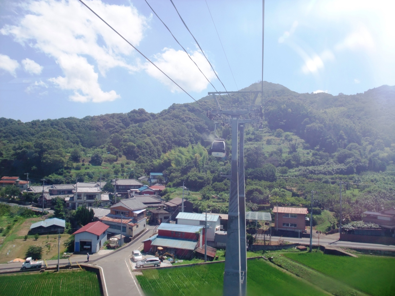 昼食バイキングの後、ゴンドラで葛城山の山頂まで登りました。町を越え、丘を越え、谷を越え、7分間のゴンドラによる空中散歩です。眺めは素晴らしく、なかなか爽快ですが、高所恐怖症の人には少しきついかも知れませんね。