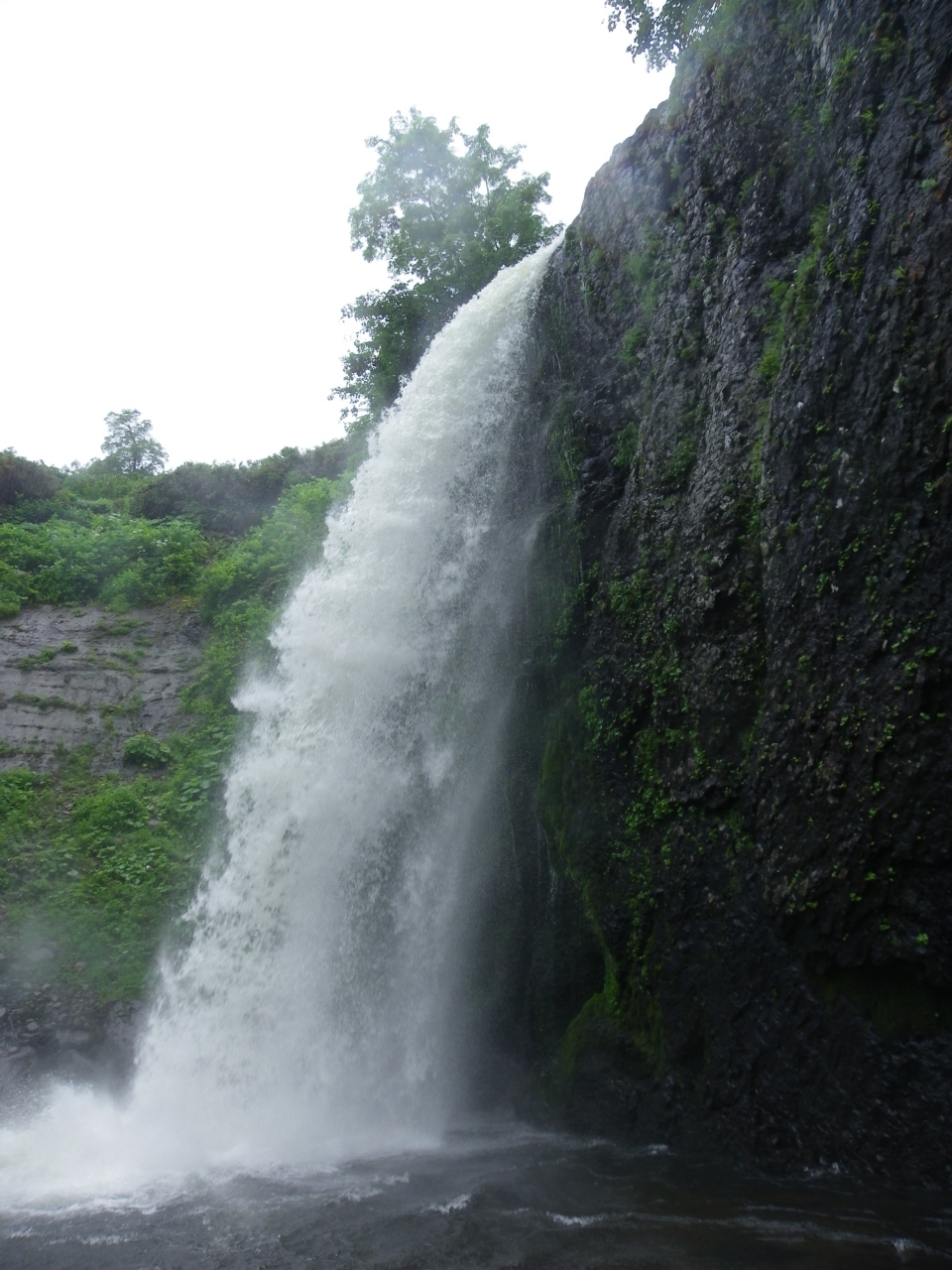 危なっかしいロープを伝って川底に下りると滝直下に立つこともでき、容赦なく飛んでくる水しぶきとド迫力の滝風景に圧倒されます。