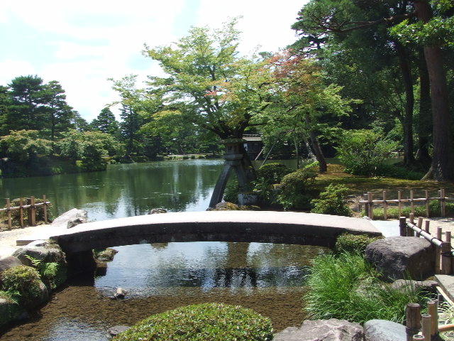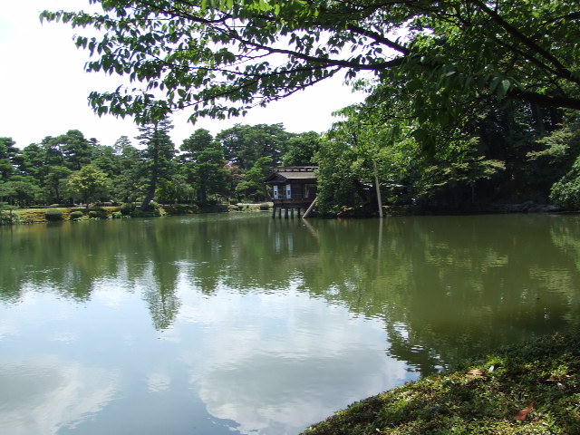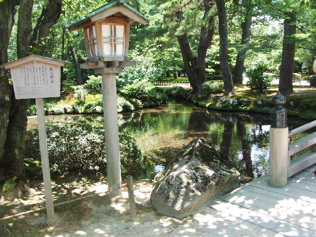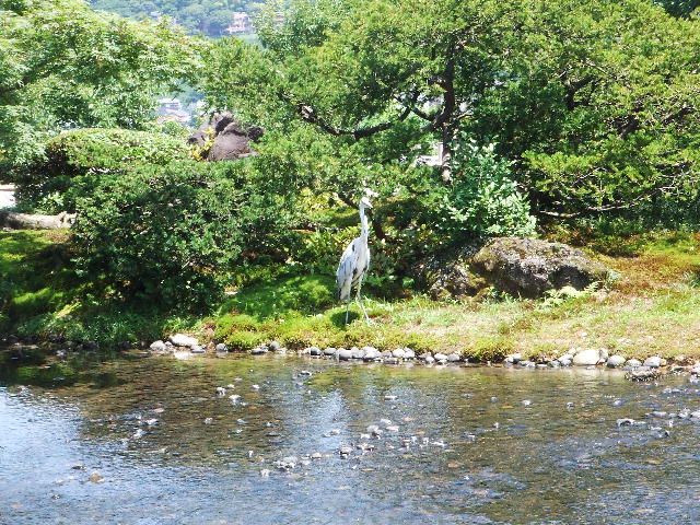 辰巳用水と言うのが園内をながれていて、たくさんある池に注いでいます。観光客がそぞろ歩きする園内を大きな鷺がたたずんでいました。