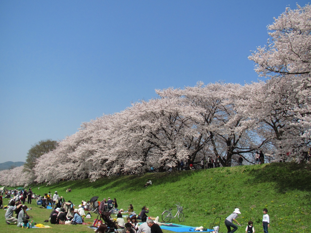 背割堤は桂川、宇治川、木津川の三つの川が合流して淀川と名前が変わる地点にある堤防です。周囲は公園として整備されていて、約1.4kmある堤防にソメイヨシノが植えられ、スケールの大きい桜並木となっています。