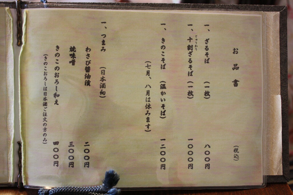 メニュー数は多くありません。ざるは、二八そばか、十割そば。おいしく食べてもらうようにとの思いから大盛りは受け付けていないようです。2枚食べる人も、同時にサーブされることはなく順次だされるとのこと。
