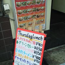 ランチに利用しました。メニューは固定3種(グリーンカレーなど)、日替わり3種(タイ風チキンラーメン、海老のココナッツカレーなど)の計6種類ありました。
