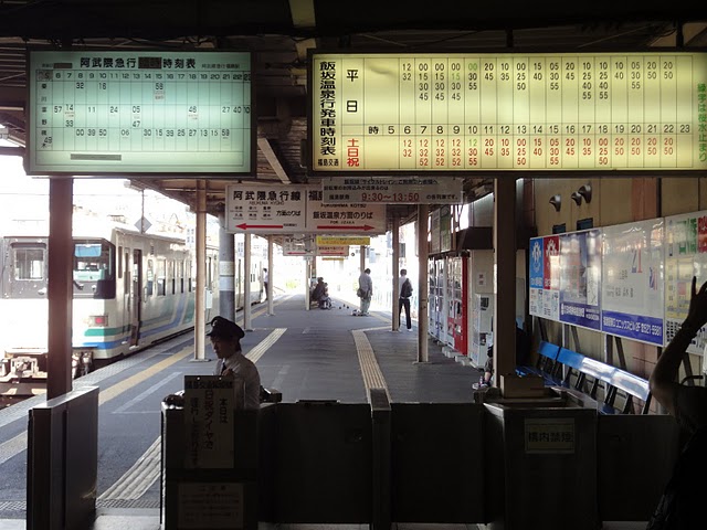 JR福島駅から福島交通に乗り換えるときは、案内版どおりに進んで、(途中エレベーターを使います)いったん改札を抜けて、福島交通の券売機で切符を購入してから再入場します。新幹線からの乗り換えには、10分程度の時間の余裕をみておいたほうがよいです。福島交通はSUICAは使えません。