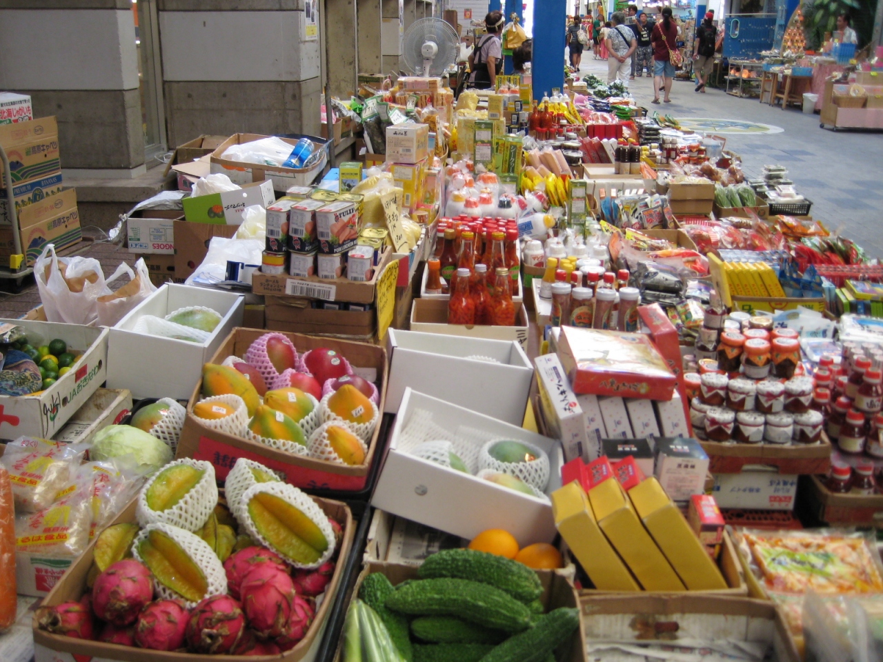 市場ビルを囲むように、青果の露天、土産物店が並んでいる