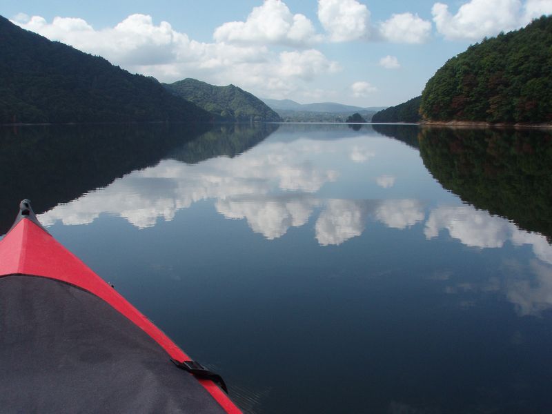 運が良ければ、雲が映る鏡のような湖面に出会えます! <<秋元湖カヌー行>>