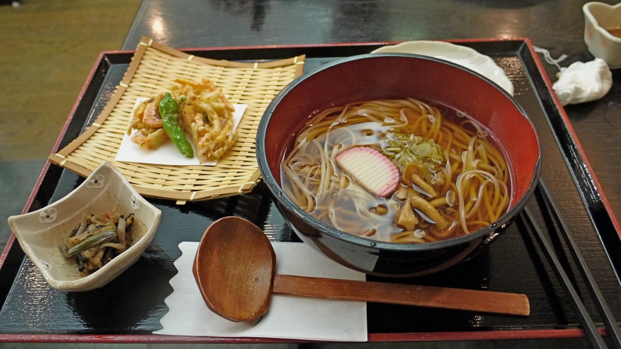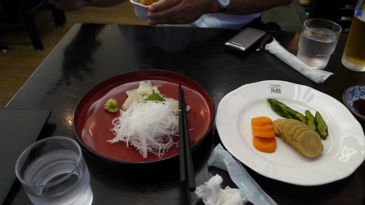 新幹線が台風による倒木のため2時間以上遅れたため,ここで夕食を取った.お新香や肉じゃが,いかさしに稲庭うどんセットなどたべた.カレーが500円,このうどんセットも950円と安い.公営レストランのような安さだが,味は平凡.温かい稲庭うどんセットはおいしかったが.
