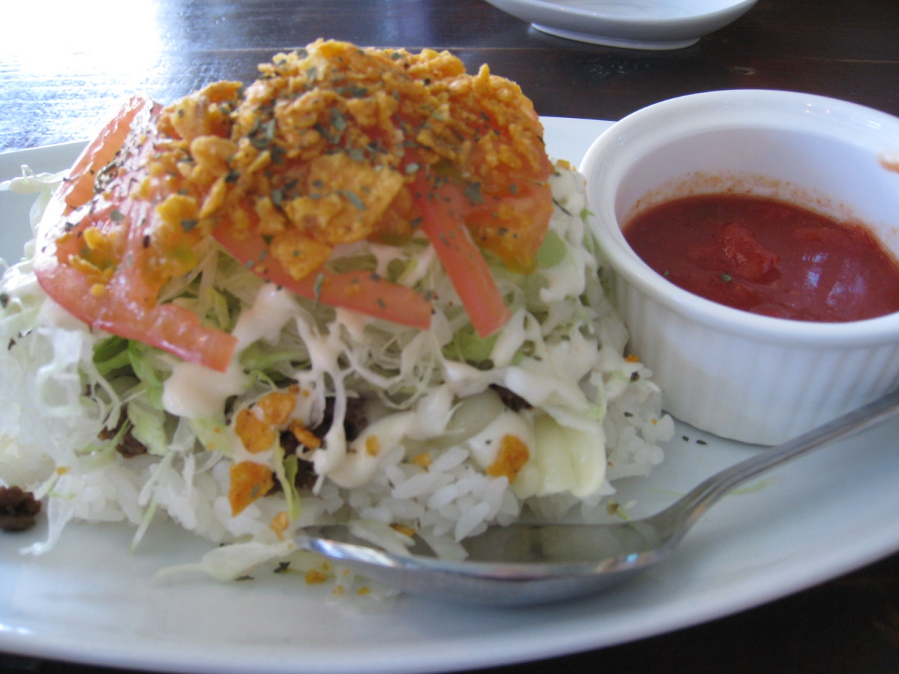タコライスにかけるピリッとするサルサソースが絶妙!!!