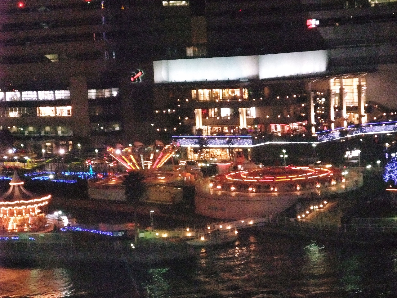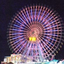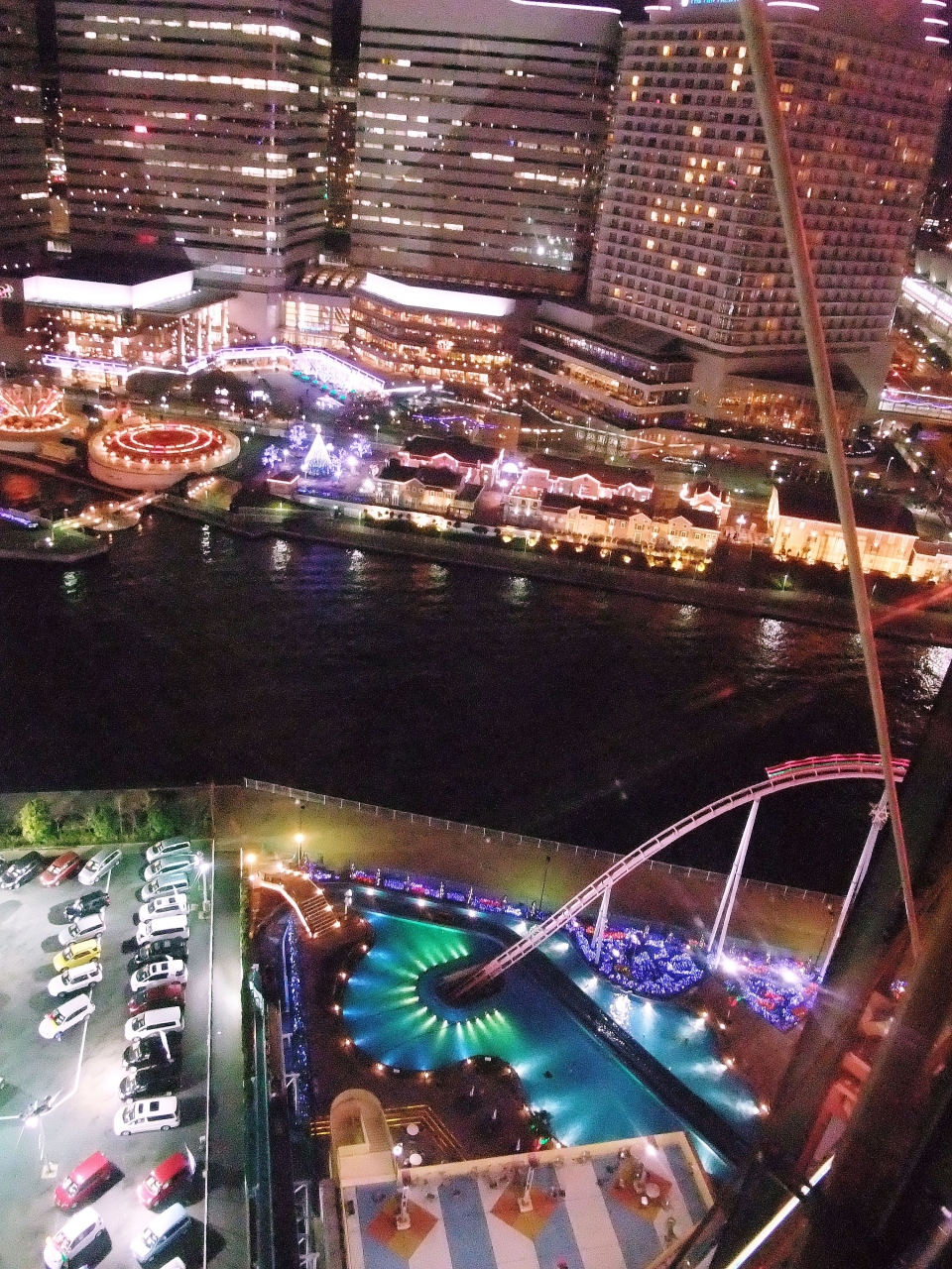 観覧車からは、川の対岸に、ライトアップされたコスモワールドの遊具などが綺麗にみえます。真下には駐車場とダイビングコースター「パニッシュ!」も見えます。