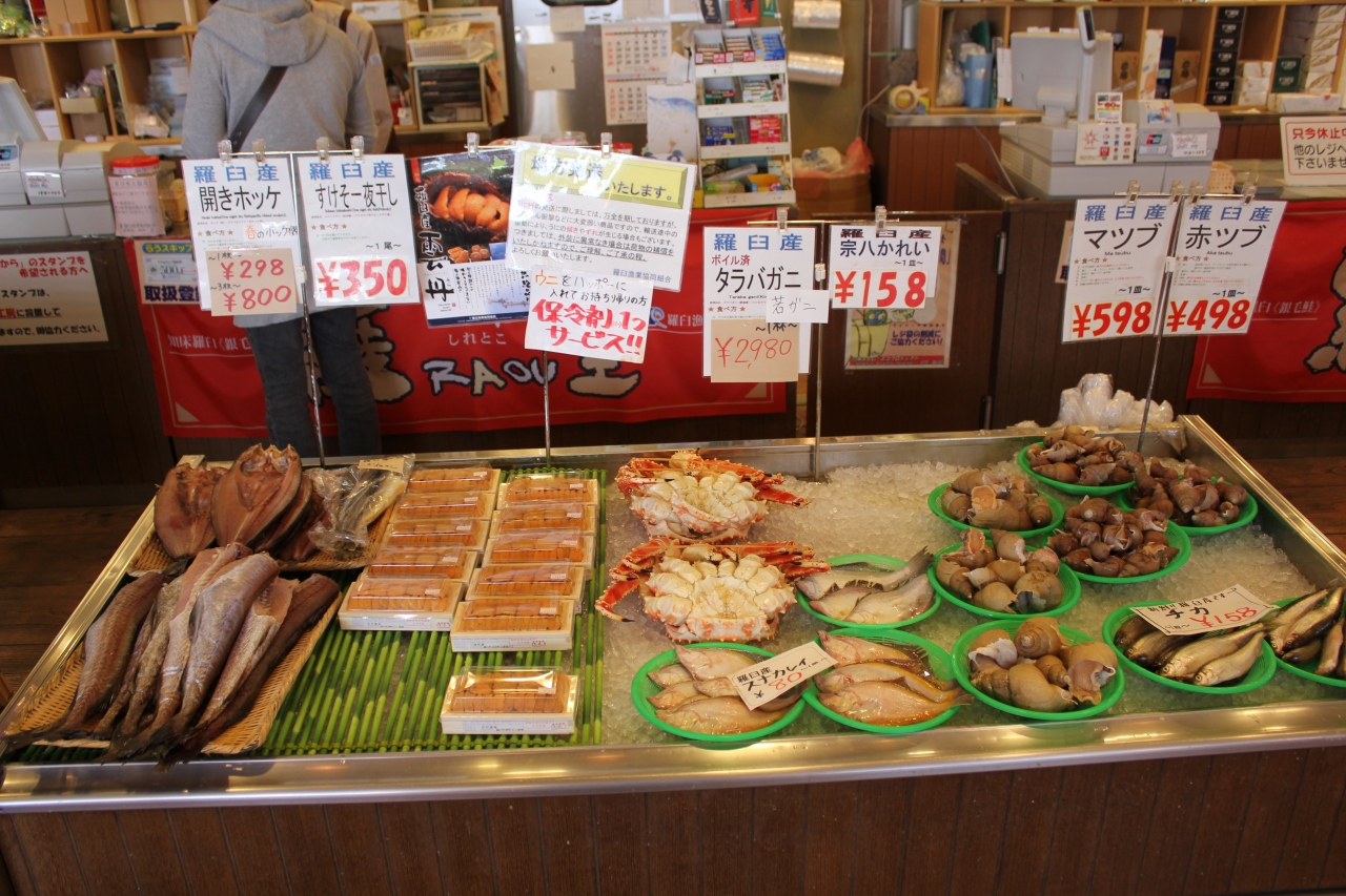 魚屋さんが何軒も入っています。地元の魚が沢山売っています。生牡蠣を売っていて、すぐに剥いてくれるということだったので食べました。1個170円です。美味しかったです、ドライブの途中の為、飲めなかったのが残念。鮮魚や蟹も有りましたが、この日はホテル泊で、家に帰らないので買うことをあきらめました。
