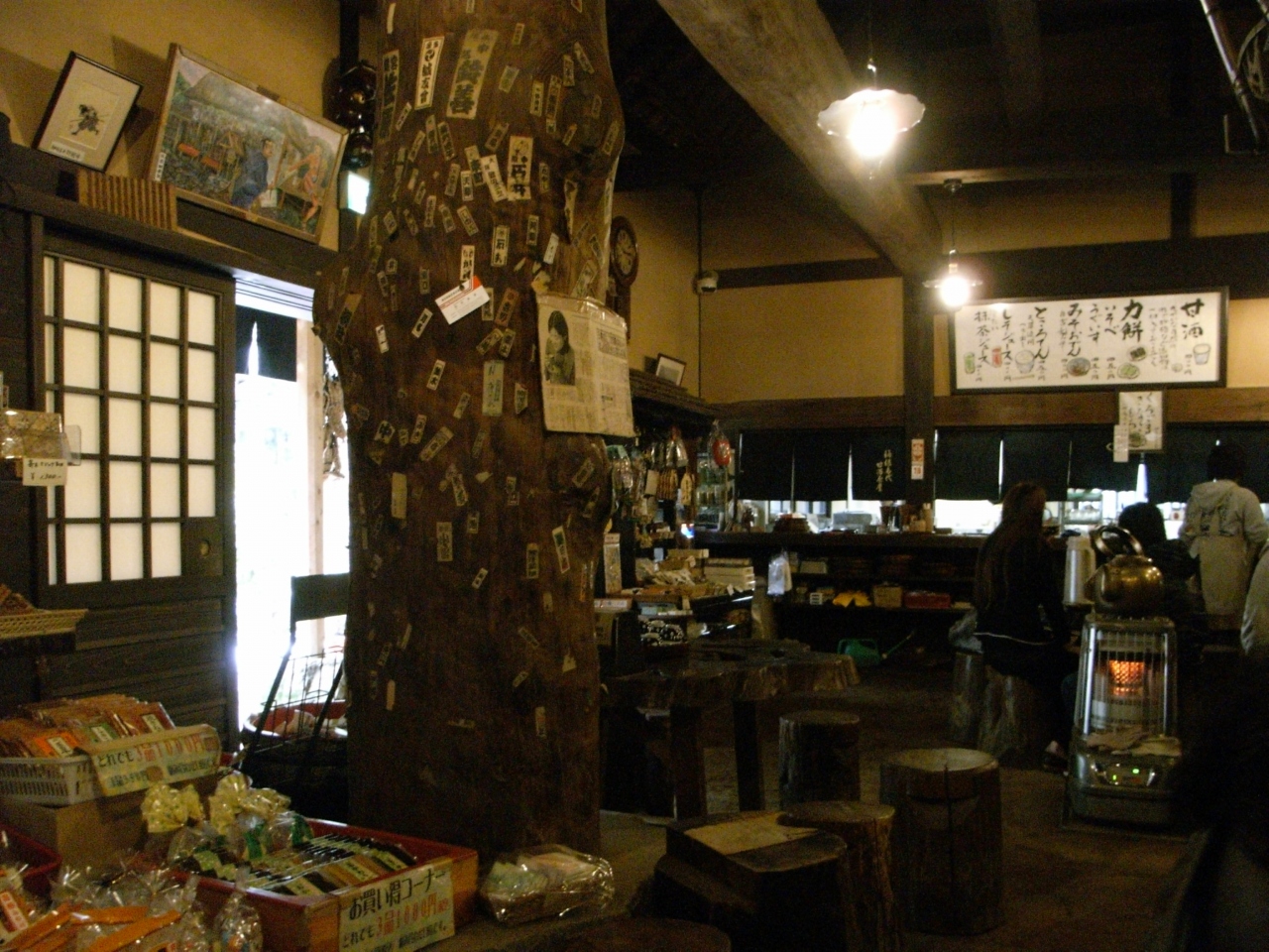 店内も土間に適当にテーブルを散らしてあり、照明も暗く、古民家の風情満載。