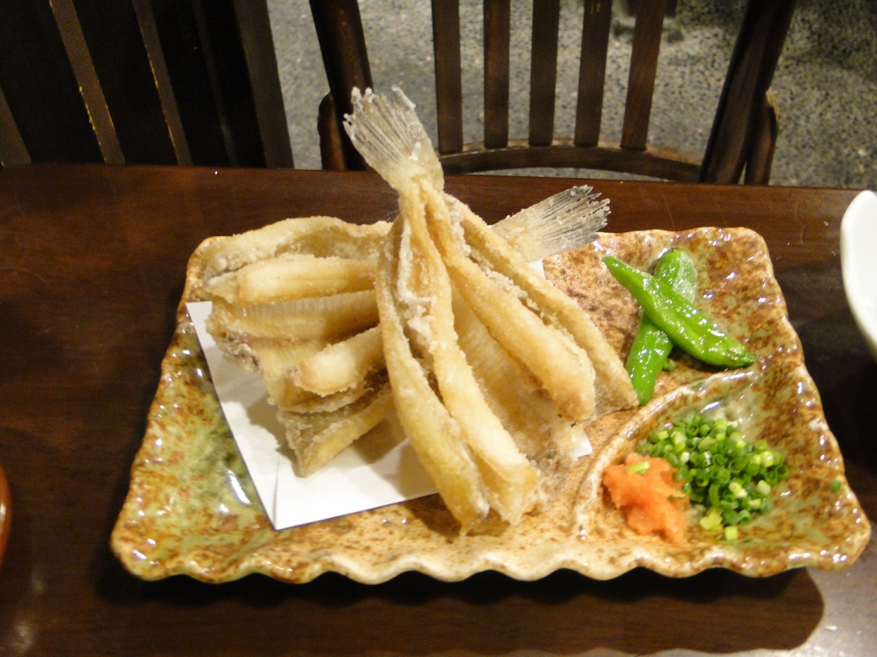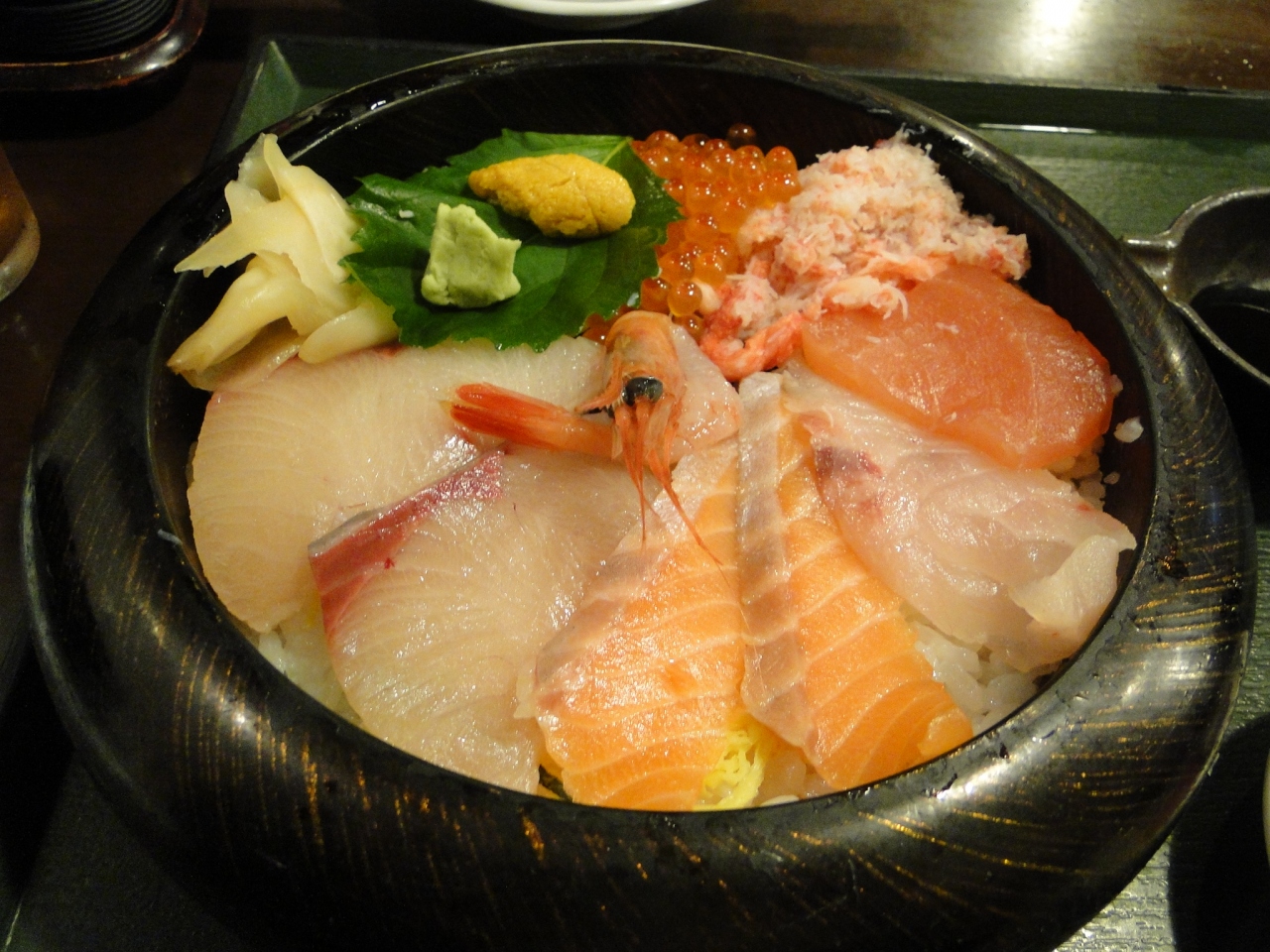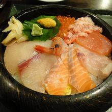近江町市場の路地裏にある食堂で、手頃な価格のメニューがそろっている。旬の刺身を盛り合わせた近江町定食他、カニ、ウニ、イクラ、エビ、マグロの5種類のネタから3種を選べる3宝盛が楽しめる。これらの海鮮丼もよいが、本当に美味しいのは店長のお薦め、地物の美味しい食材を使った一品料理が千円以下で食べられる。もちろん、高級食材は時価であるけれど。