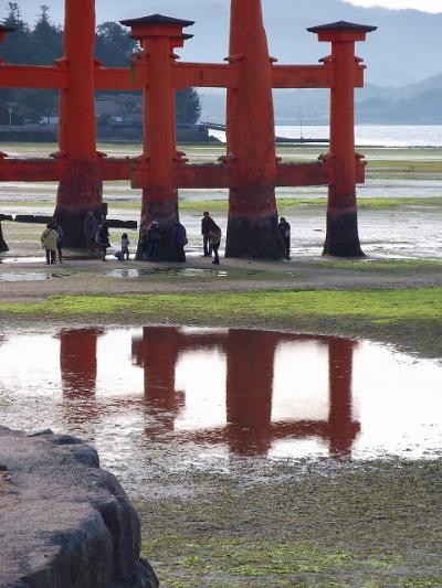 宮島の大鳥居、木で出来てる鳥居としては日本一だと思います。しかもこの大鳥居、海に浸かる鳥居の基礎の部分は、ちゃんと基礎工事がして有るのではなく、だだ置いてある状態です。そんな訳で厳島神社と書いてある、横の梁の部分に重みを付ける為に石が入っています。台風が来ても、高潮で潮位が上がっても倒れません。