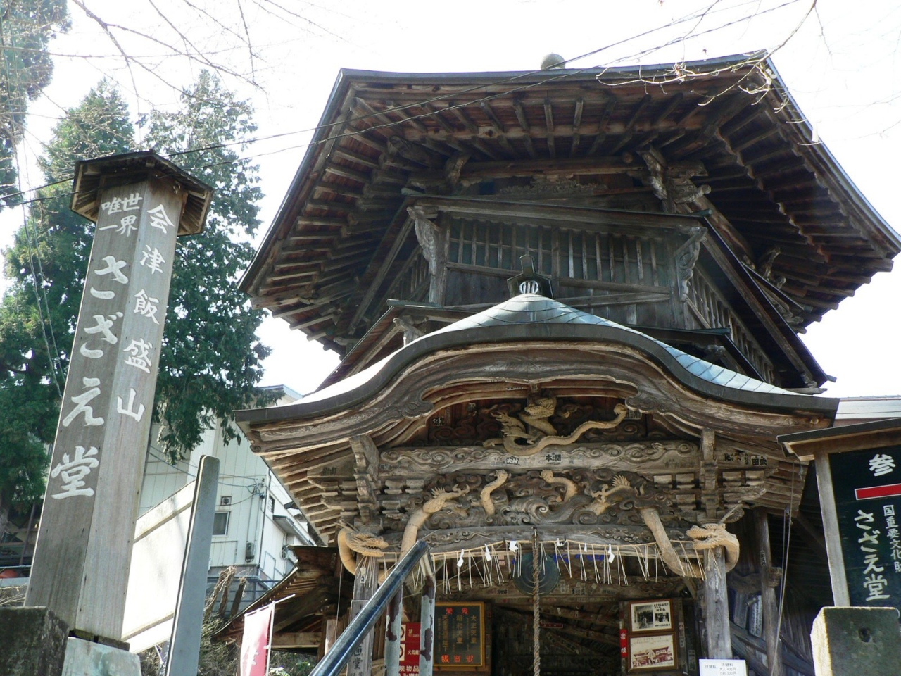 さざえ堂は二重らせん構造の斜路をもつ特異な建物として知られ飯盛山の中腹に建つ。「会津さざえ堂」「さざえ堂」と呼ばれ、正式名称は「円通三匝堂」(えんつうさんそうどう)。