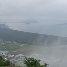 鏡山に登り、展望台から唐津市を望めば、虹ノ松原を一望できる。虹ノ松原の景観を楽しむのであれば、おそらく鏡山からの眺めが一番良いのではないだろうか。遠目に唐津城を望み、カーブを描いた松原と美しい海岸線は素晴らしい。