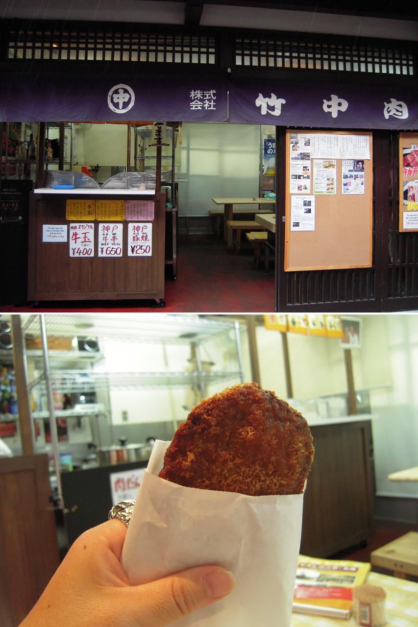 店内には、もちろんお値打ちな神戸肉が販売されているのだが、その肉を使ったコロッケ、メンチカツ、神戸肉串、豚串などが併設の簡易食堂のようなところでいただける。