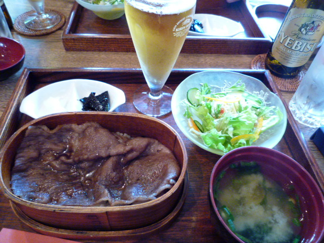 ランチで「大和牛の牛重」1000円をいただきましたが、お肉が柔らかくちょっと甘めのタレが絶品でした。サラダ・味噌汁・漬物がついています。+350円で飲み物(ビール、ソフトドリンク、コーヒー)またはシフォンケーキが付いてきます。