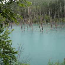 駐車場から10分ほどの歩きで、ミルキー色と青色の入り交じった何とも不思議な池に到着しました。生憎の天気だったのですが、ちゃんと神秘的な青色を見せてくれました。あただ、天気が良いともっと色が変わるとかで、次回は晴天日にリベンジしたいなと思いました。