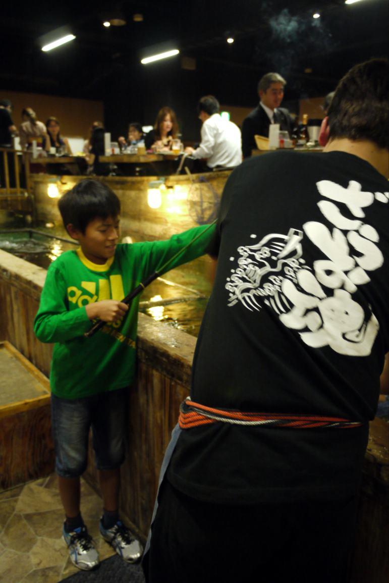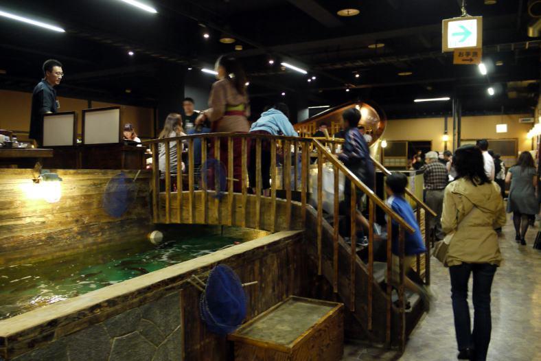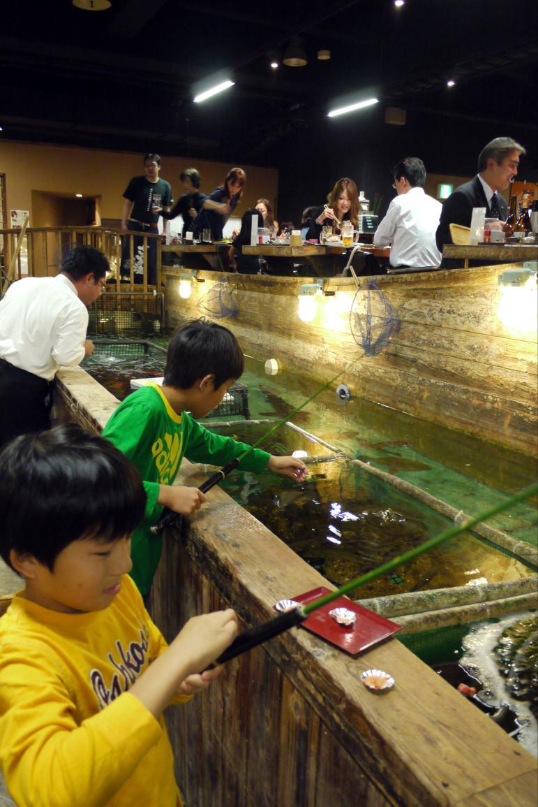 釣船茶屋 ざうお 新宿店では大きな船の周りの水槽で泳ぐ魚を釣って、お好みの料理法で出してもらいます。