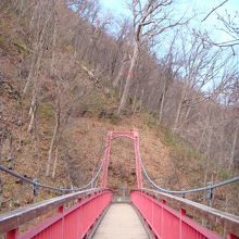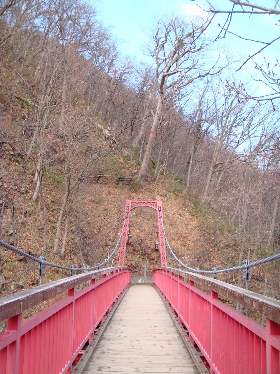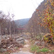 川原で遊んだ後は、赤い橋二見吊り橋を目指します、この橋が風景にとけこんで美しいのです。