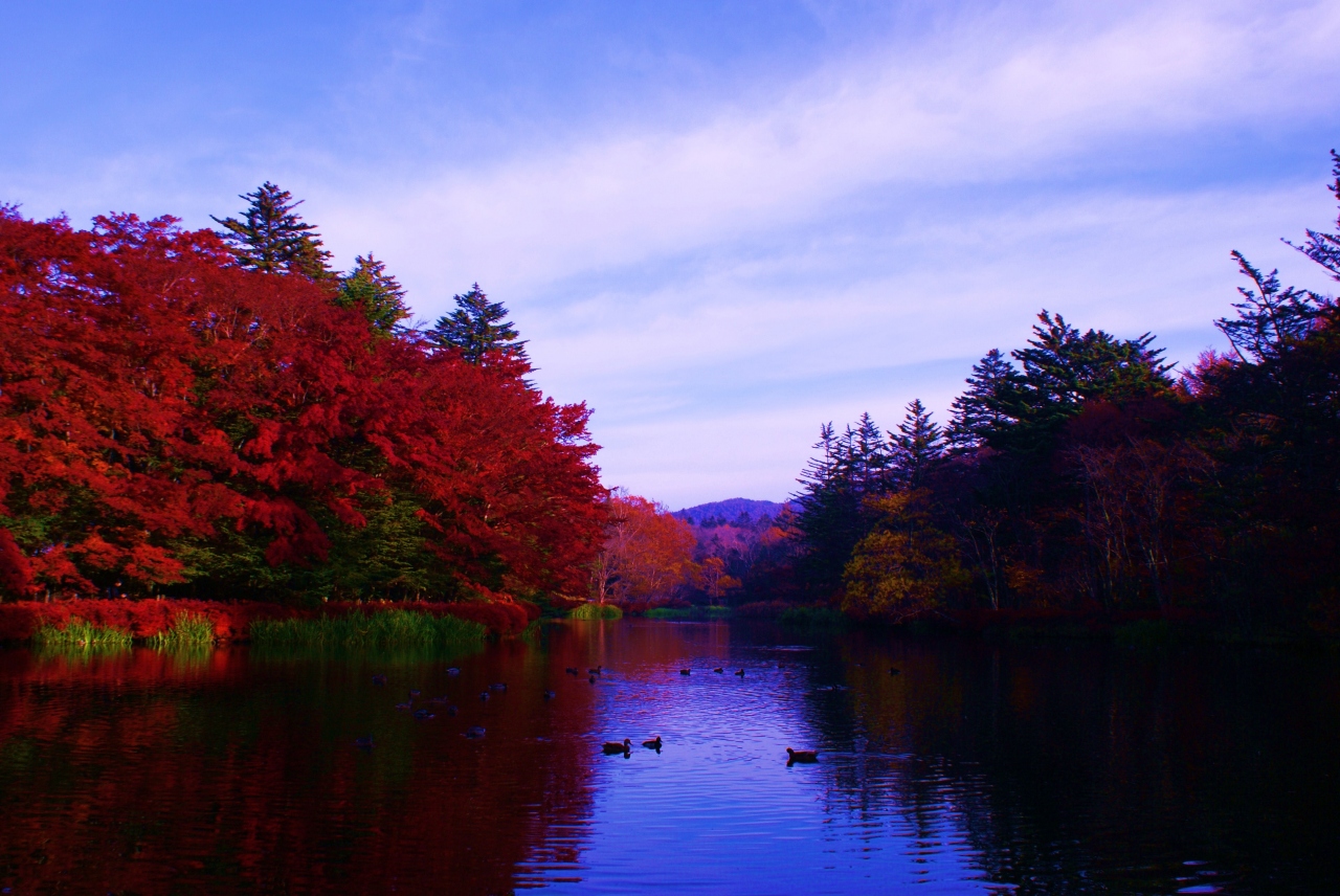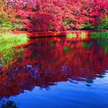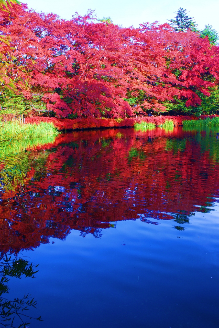 紅葉の季節はとにかく混雑しますので朝陽と紅葉で真っ赤に輝く雲場池が