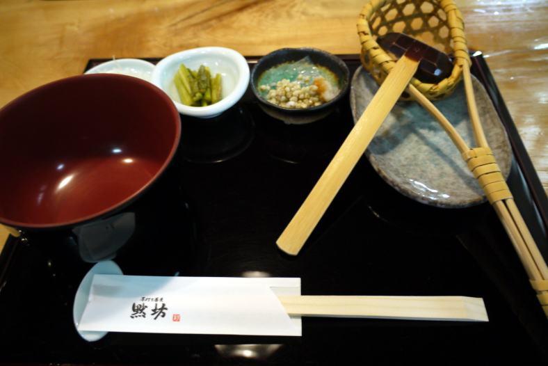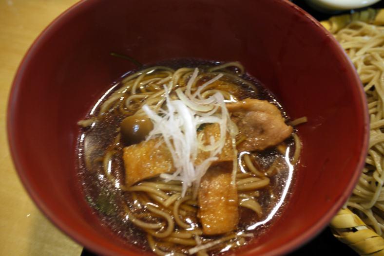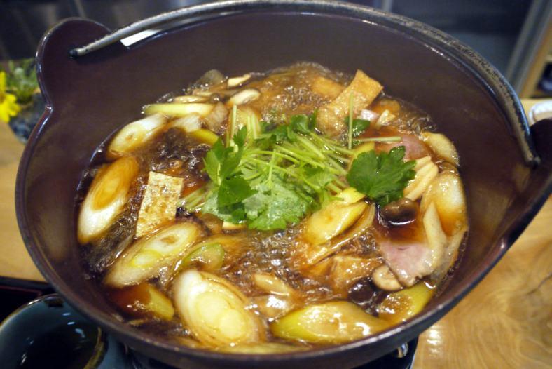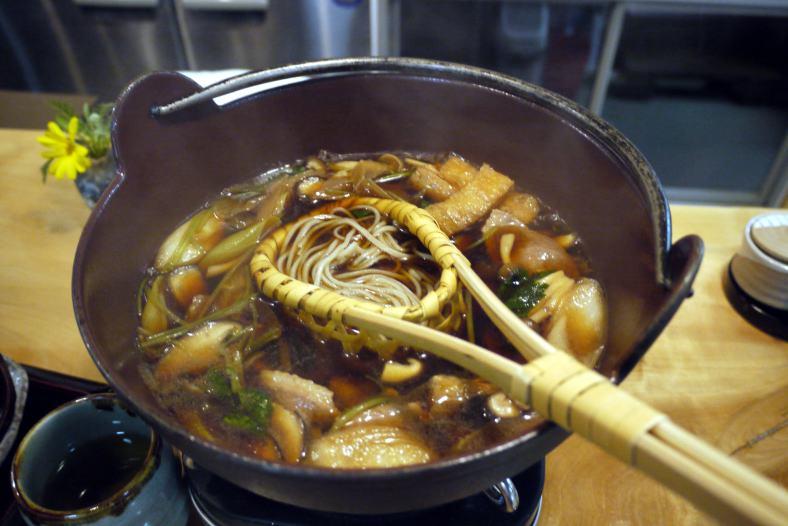 手打ち蕎麦 黙坊の名物とうじそばは、コンロに乗った熱々の鴨鍋にキリリと冷たく締まった蕎麦をとうじ篭に一口分入れて、鴨鍋にくぐらせて頂きます。