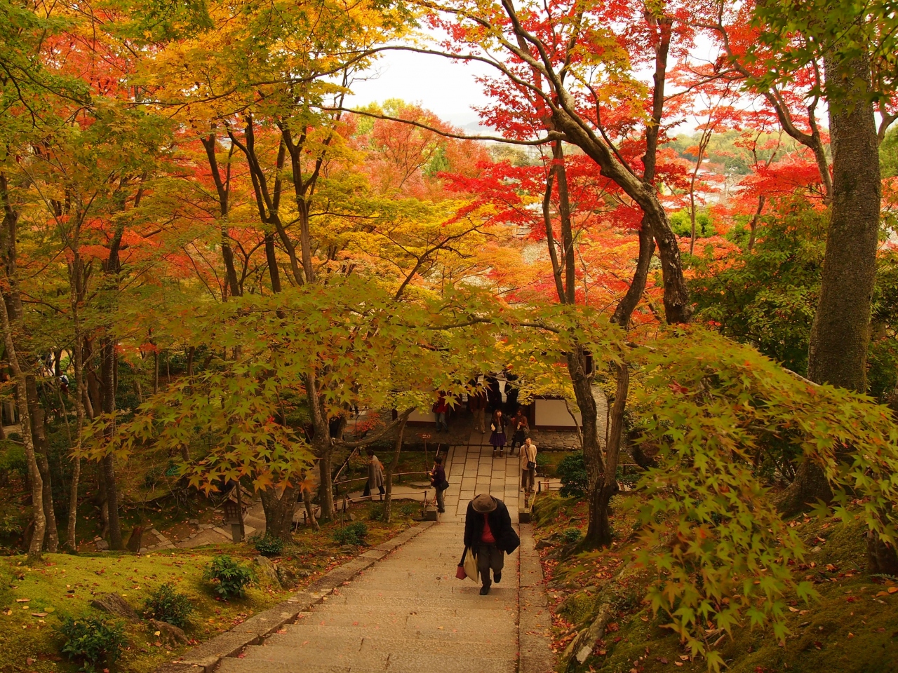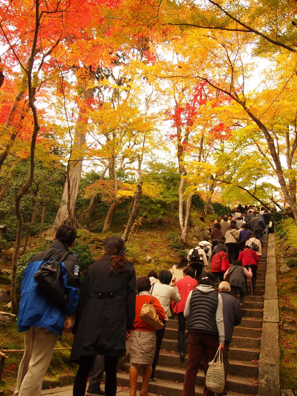 11月23日現在山門前の参道はまだほぼ青葉ですが門をくぐった石段付近は黄色から橙へと色づき始めました。