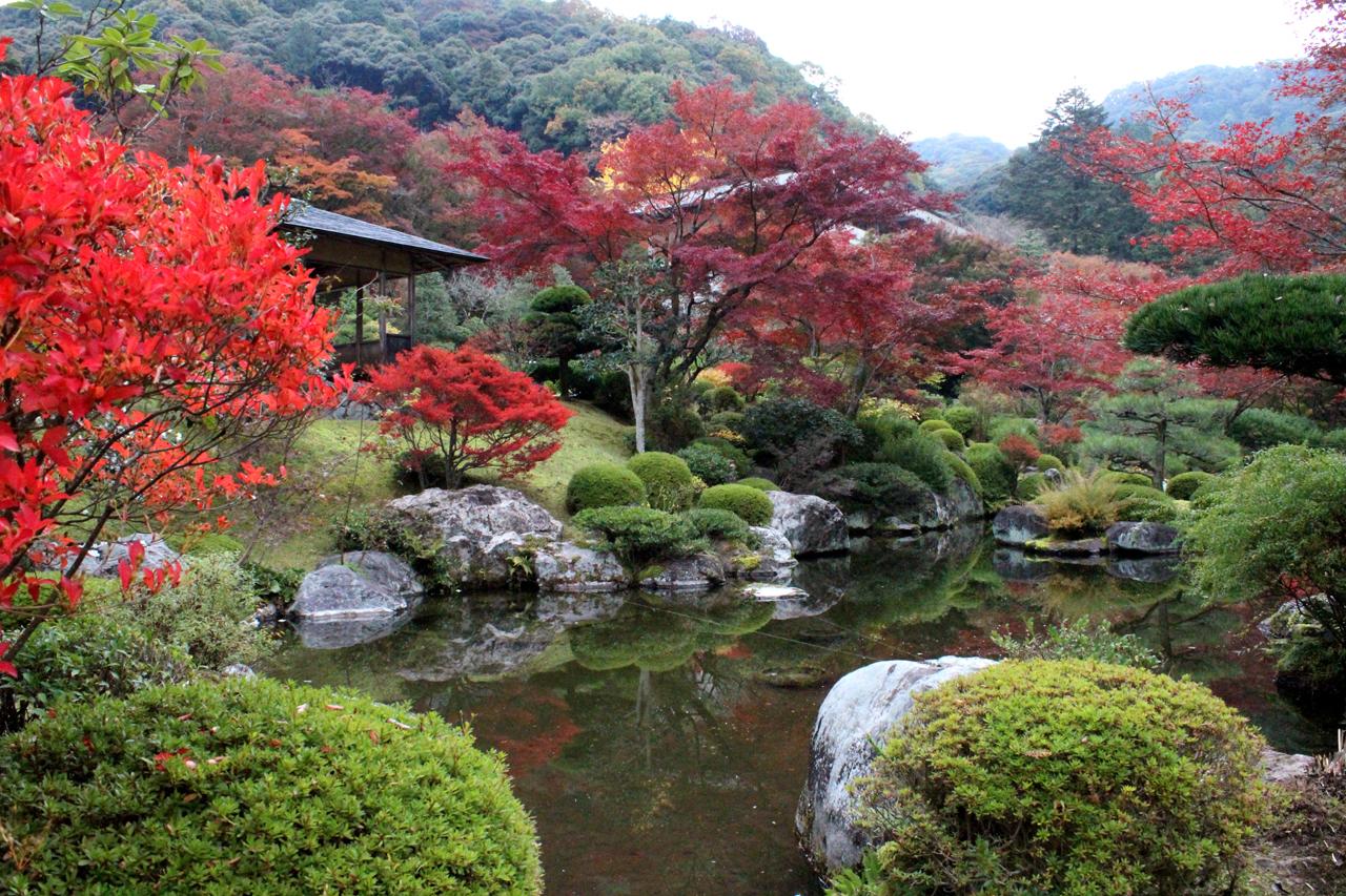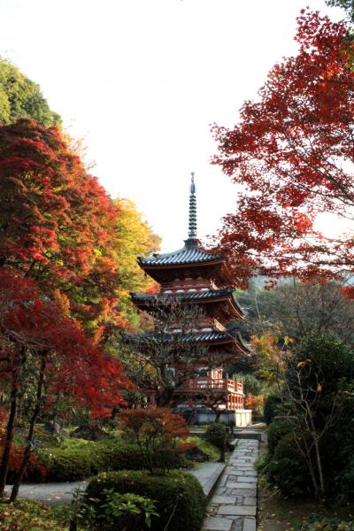 三重塔と赤く色づいた紅葉はなかなか見ごたえがあり、また枯山水庭園と池泉庭園の見ごたえも十分。