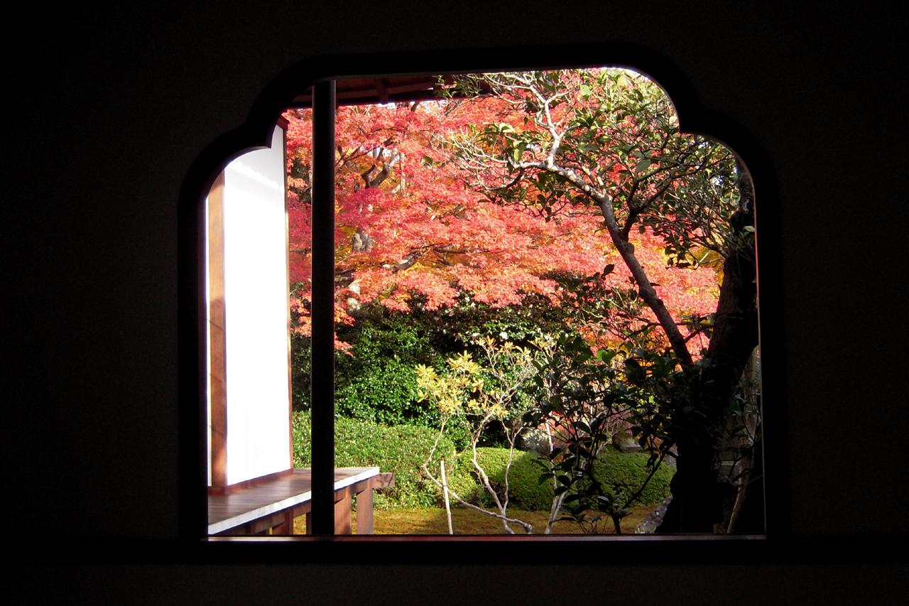 丸い窓越しに見る紅葉風景「悟りの窓」と四角い窓越しに見る紅葉風景「迷いの窓」