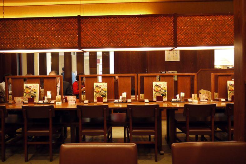 信州そば あずみ野の店内は、長いカウンターの周りにテーブル席が並んでいます。