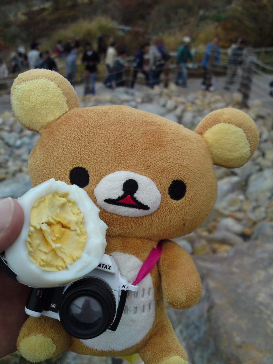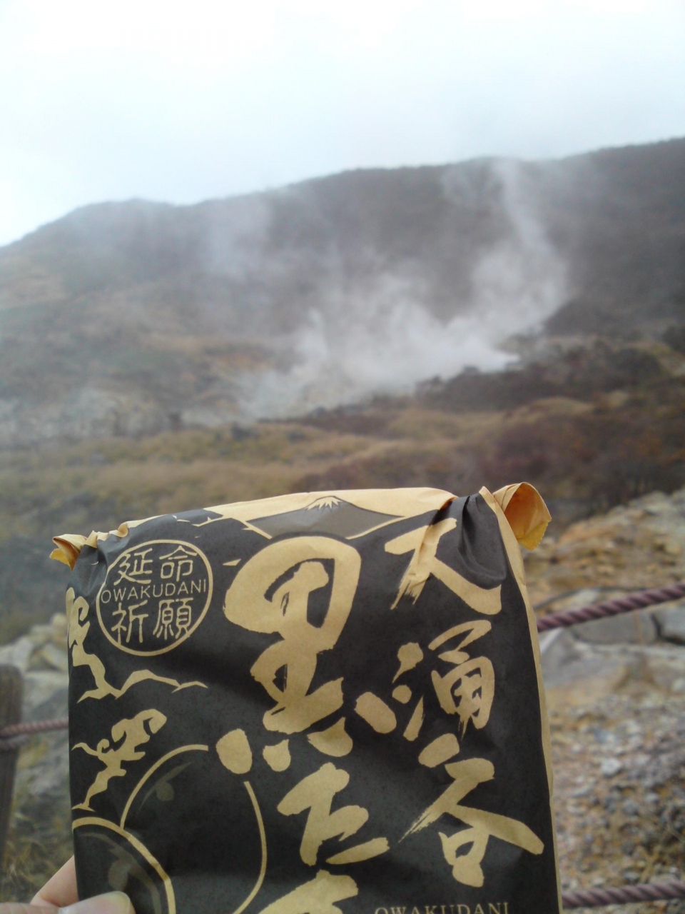 ロープウェイの待ち時間は10分かからない位で乗車出来、14時30分頃には玉子茶屋の黒たまご(5個入り500円)を食べていました。