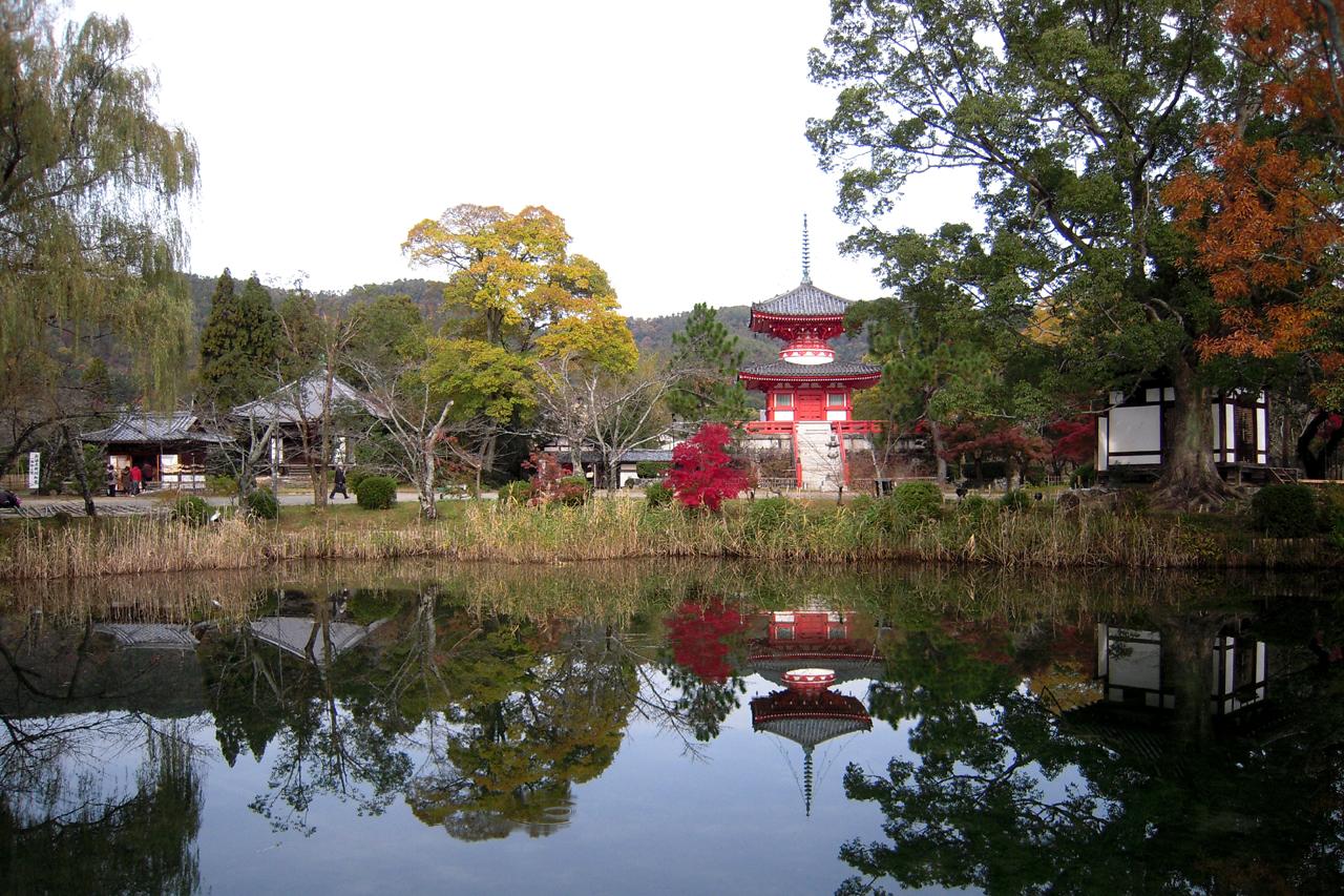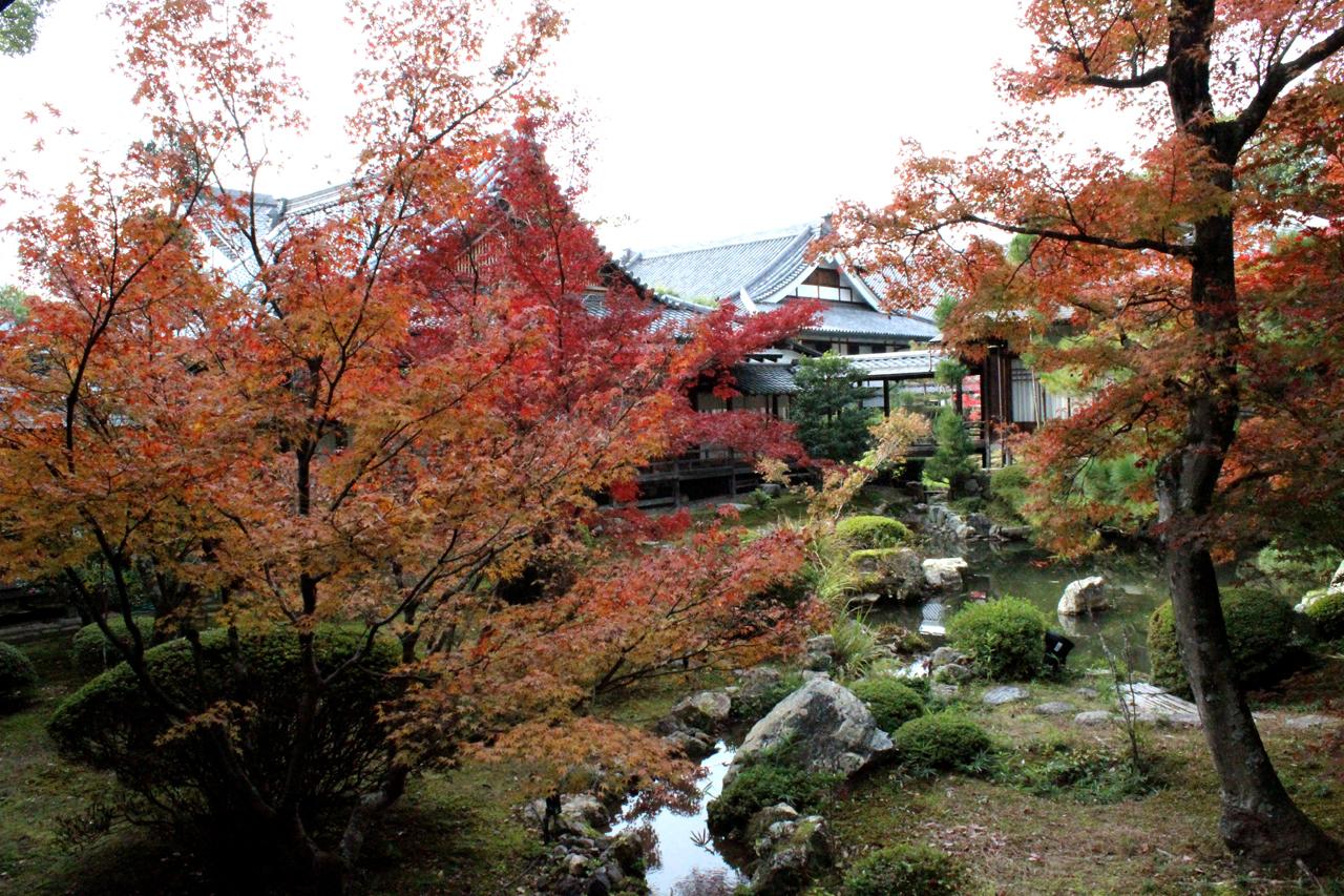 大沢池に映る塔の紅葉や境内に広がる紅葉も美しいですが、それ以上に庭園や庭園を巡る回廊が美しく、その周りにある建築物や襖絵なども観賞価値が高いので、紅葉の時期といわず、年中楽しめる広大な寺院です。
