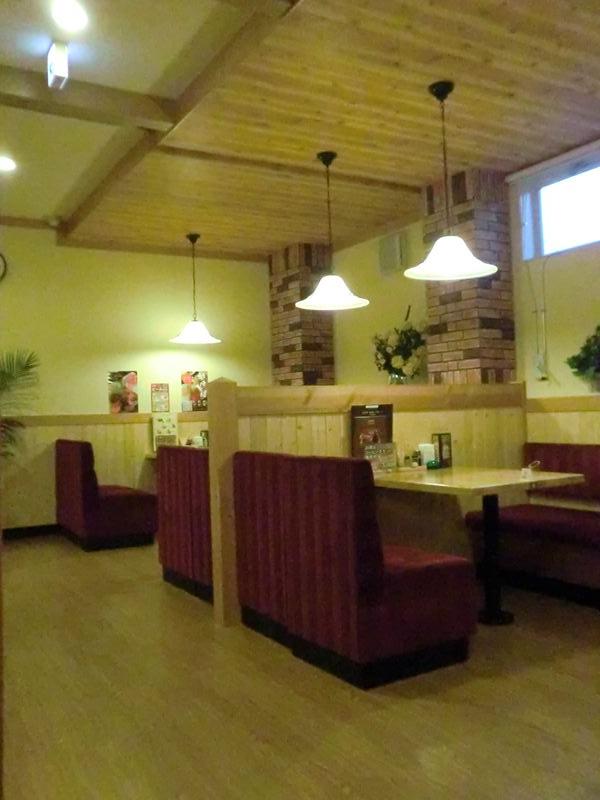 - 赤いベロア調のシートに木目調で各テーブルが仕切られた明るい店内。あのお店に似ていますがゆっくりできます。壁沿いに一人がけの席もあり。