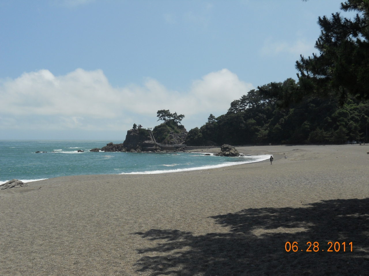 大河ドラマの「龍馬伝」を見るまで、桂浜の存在は実は知らなかったのですが、ドラマを見て以来とても見に行きたい場所の1つになりました。 坂本龍馬像のすぐ下をおりると見える、桂浜。 私達が見に行った時は波は静かに見えましたが、桂浜は波が高いので遊泳禁止の浜だそうです。 ここを実際に坂本龍馬が歩いたのかな…って思いながら実際に自分も歩けるというのが良い記念になりました。