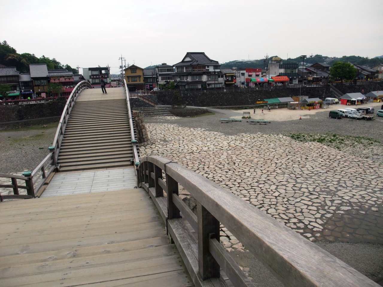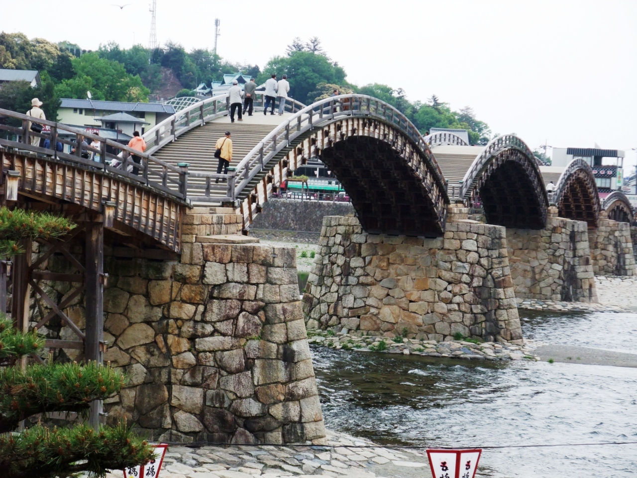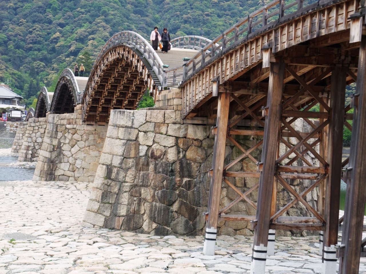 錦帯橋は、錦川にかかる五連のアーチ形木造橋です。