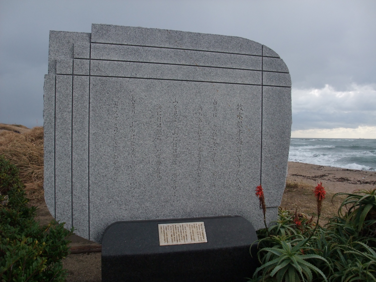 房総半島を、海岸に沿って国道410号線を走っていると、根本海岸にやってきます。 白浜町の根本海岸には、有名な若山牧水の「白鳥は かなしからずや 空の青 海のあをにも 染まずただよふ」の歌碑があります。