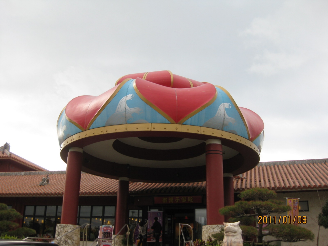 日航アリビラをチェックアウトして空港に向かう前に毎回寄るお店がお菓子御殿の読谷本店です。お店の前の真っ赤な大輪の花のモチーフが目印です。ここ本店には、タルト製造工場をガラス越しに見る事が出来ます。工場から出来たての紅いもタルトが楽しい沖縄の最終イベントとなります。