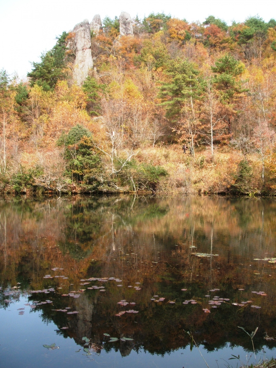 鶴ヶ原池が見えてくると、その辺りが鶴ヶ原の景のビューポイントで、耶馬溪特有の紅葉した岩山が、鶴ヶ原池に映ったところは、本当に綺麗です。