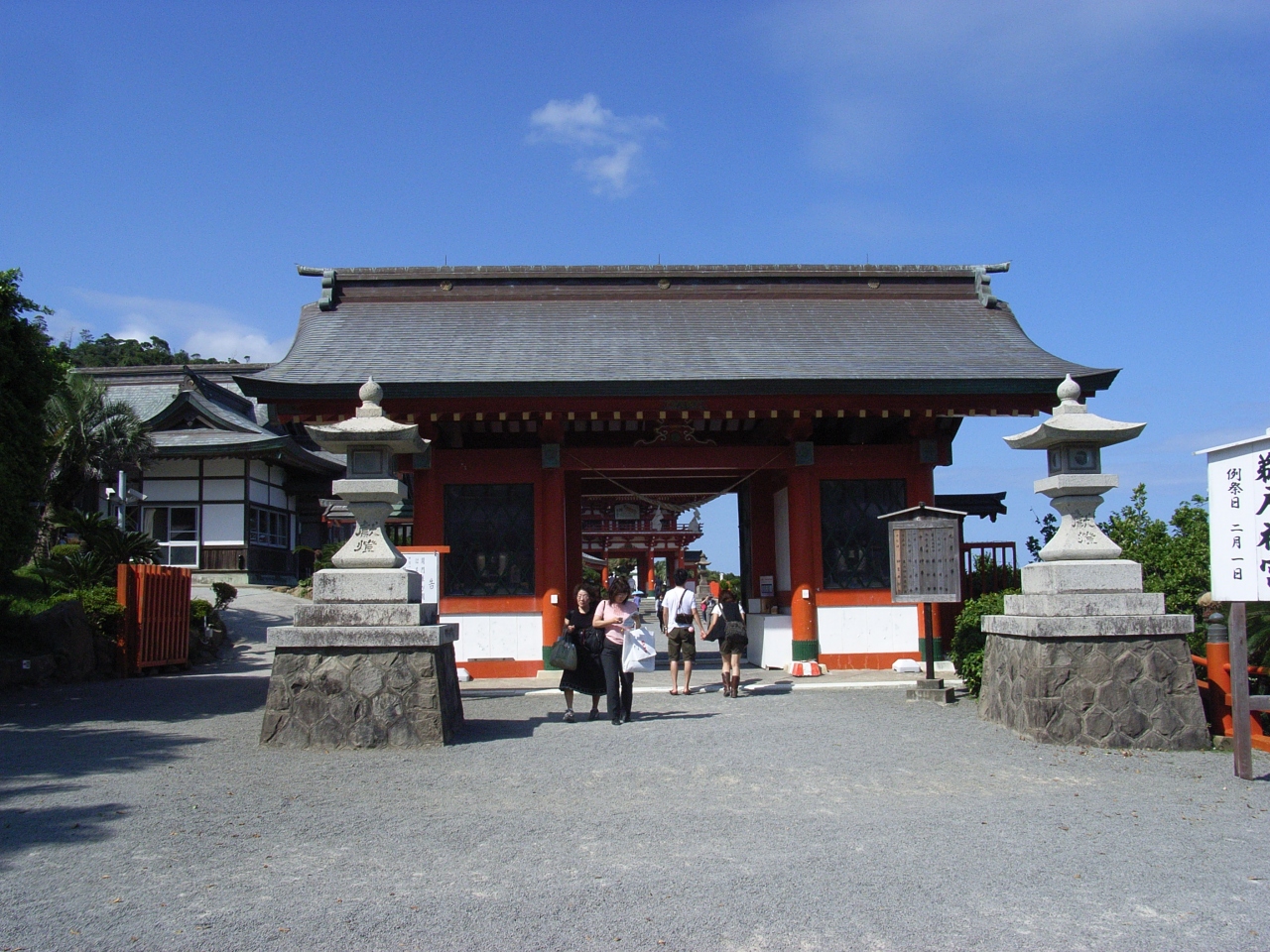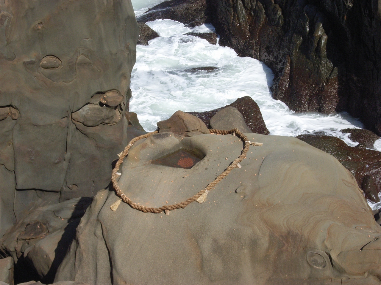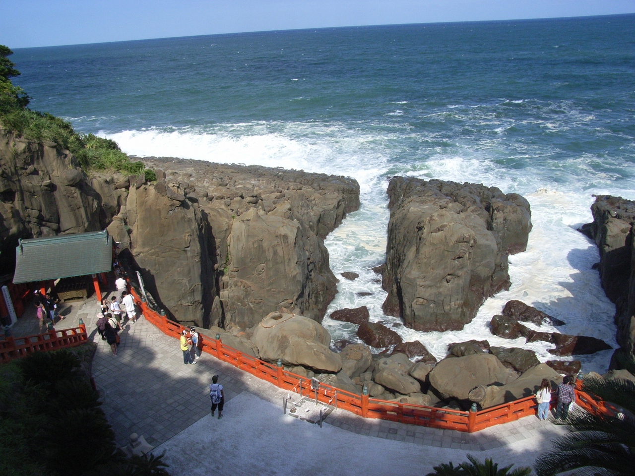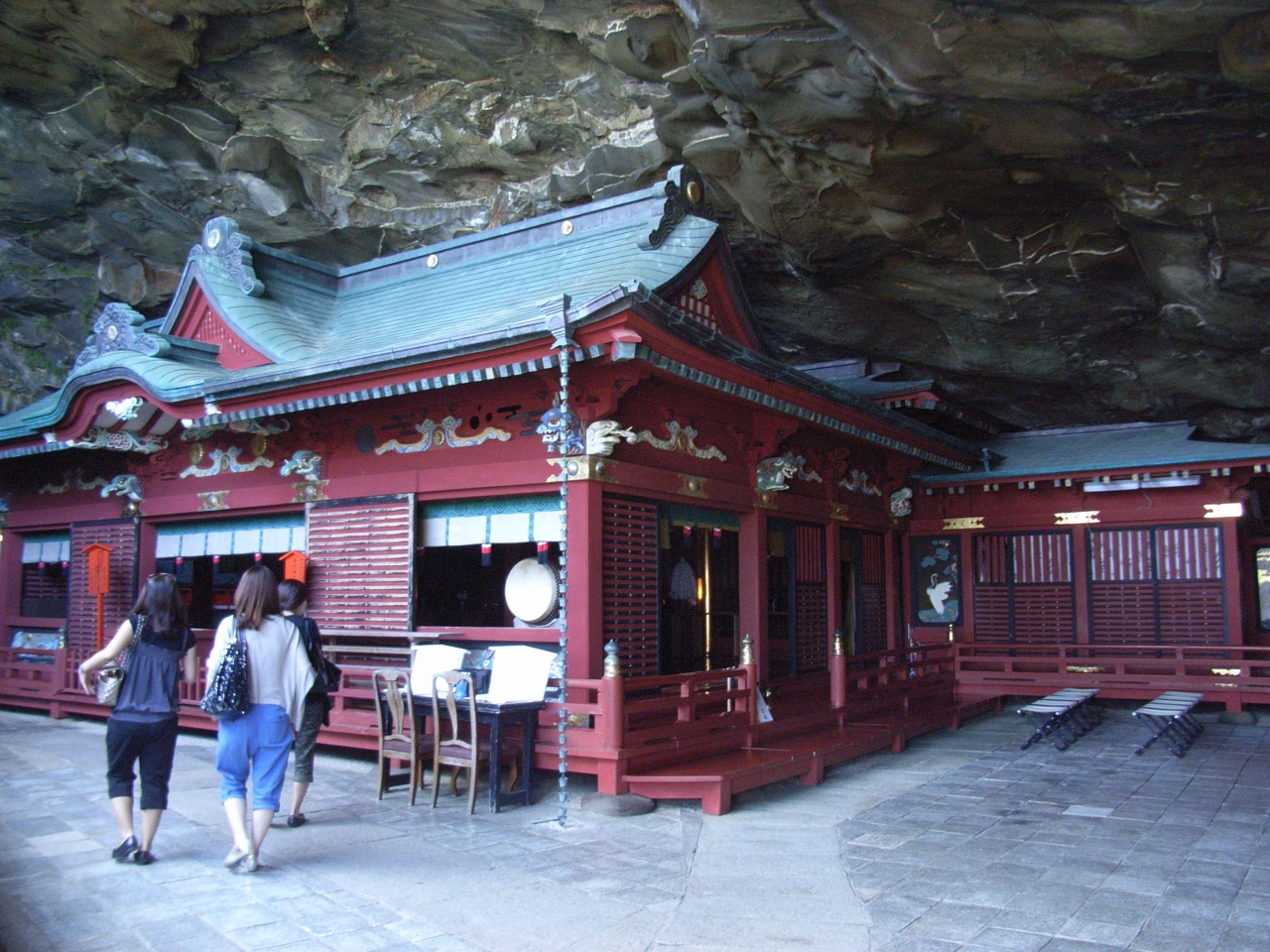 崖にそって参道があり、岩の隙間の中に赤壁の本殿があるという面白い造りで、外は太平洋の荒波が押し寄せ、迫力がありました。