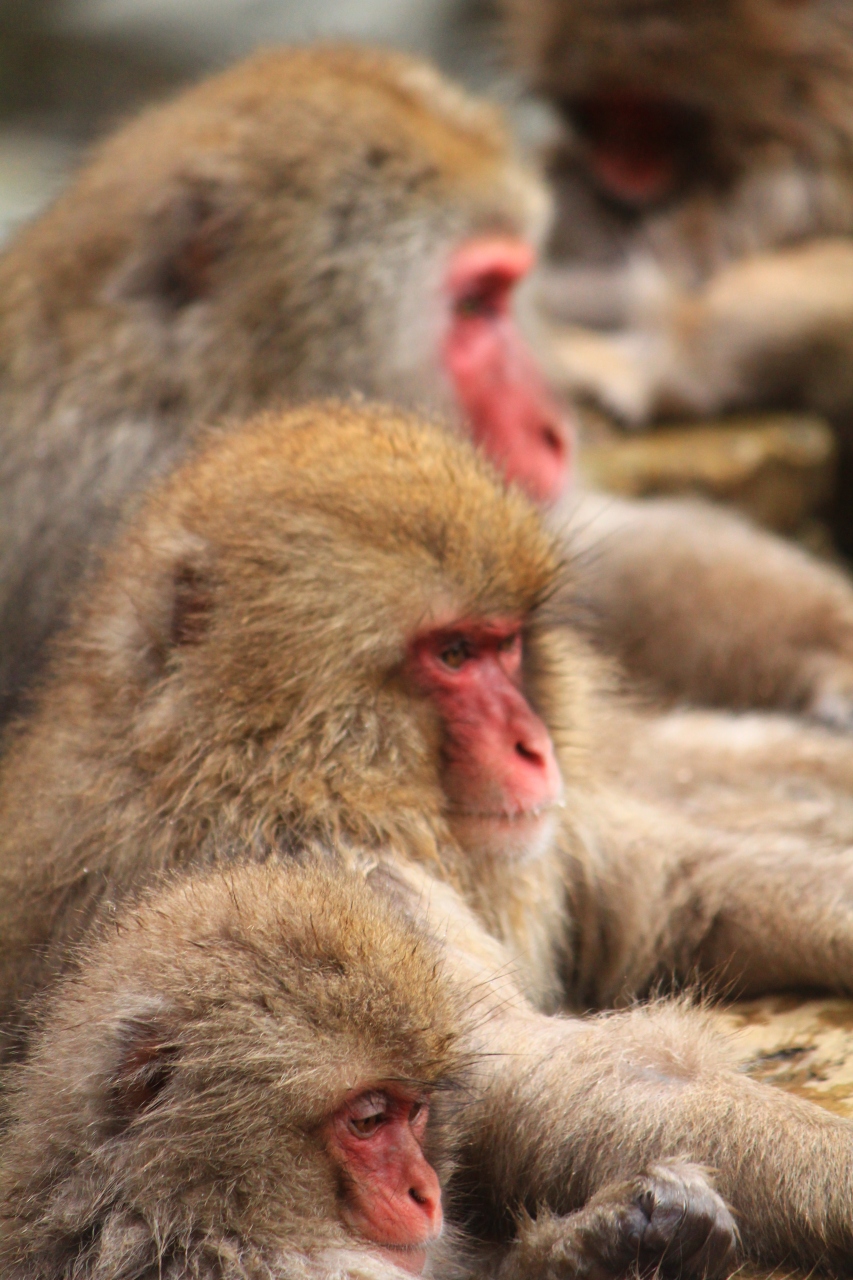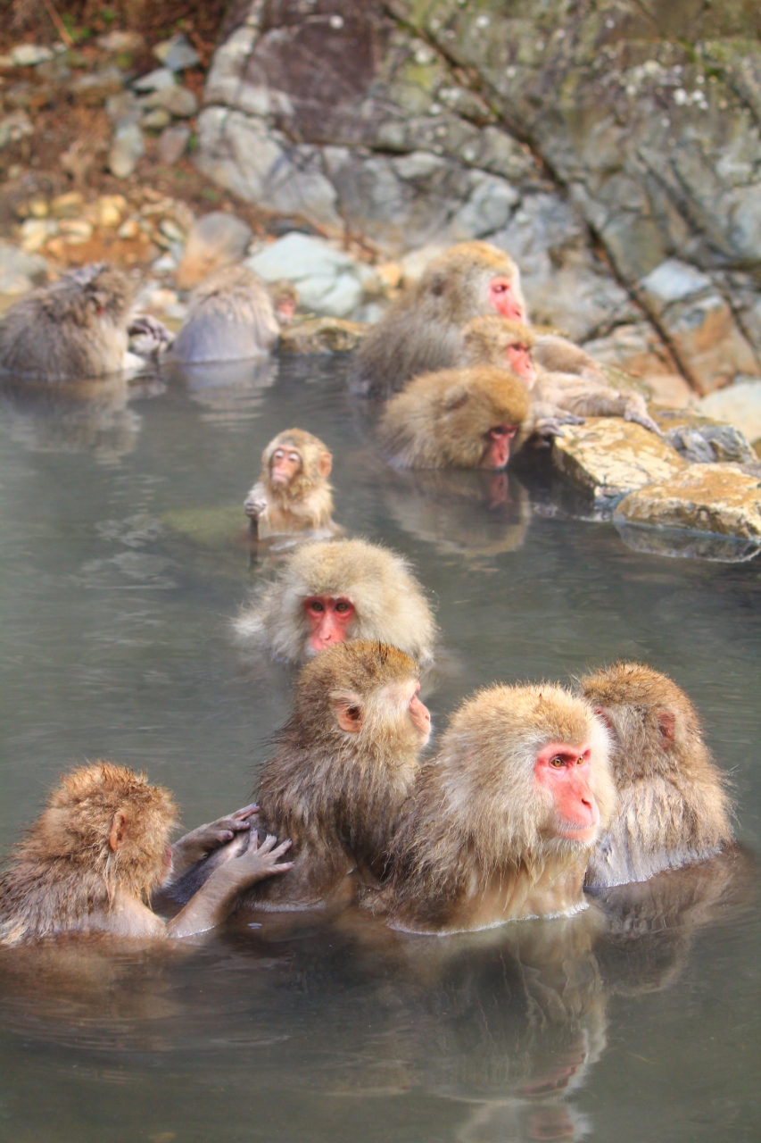 入園料は大人500円、子供250円で夏季は8:30~17:00、冬季は9:00~16:00までと季節によって開園時間が異なります。施設内にはSNOW MONKEYグッズも販売されていますが、質素な作りの建物でお土産屋にはあまり力を入れていないようでした。奥の方に進んで行くとカメラを持った外国人観光客が多く、日本人との比率は5:5位でした。旅館の人の話によると野生の日本猿を見にオーストラリア人が最近多いとのことで、温泉に入っている野生の日本猿は日本国内でもなかなか見る機会はないかもしれません。想像していたよりも沢山のお猿さん達がいて、中には小さな子猿も親猿と一緒に入っていて、可愛らしい姿を見ていると夢中で写真を撮ってしまいました。残念ながら雪が積もってはいなかったためSNOW MONKEYらしい絵は撮れませんでしたが温泉で気持ちよさそうなお猿さん達を見れて満足でした。また時間帯によっては従業員の方達が餌を撒くようで偶然、私達はその時間に当たりました。餌を撒くと山の上の方からも次々にお猿さん達が集まってきて気が付くと野生の猿が大勢いました。餌の時間帯だけは温泉には誰もいなくなってしまうのが残念ですが、できれば餌の時間帯に合わせて行くのがおススメですね。雪が降り積もる中、ここまでの道程が大変ですが出来れば雪の降る中で温泉に入る野生の日本猿を次回は写真に納めたいですね♪