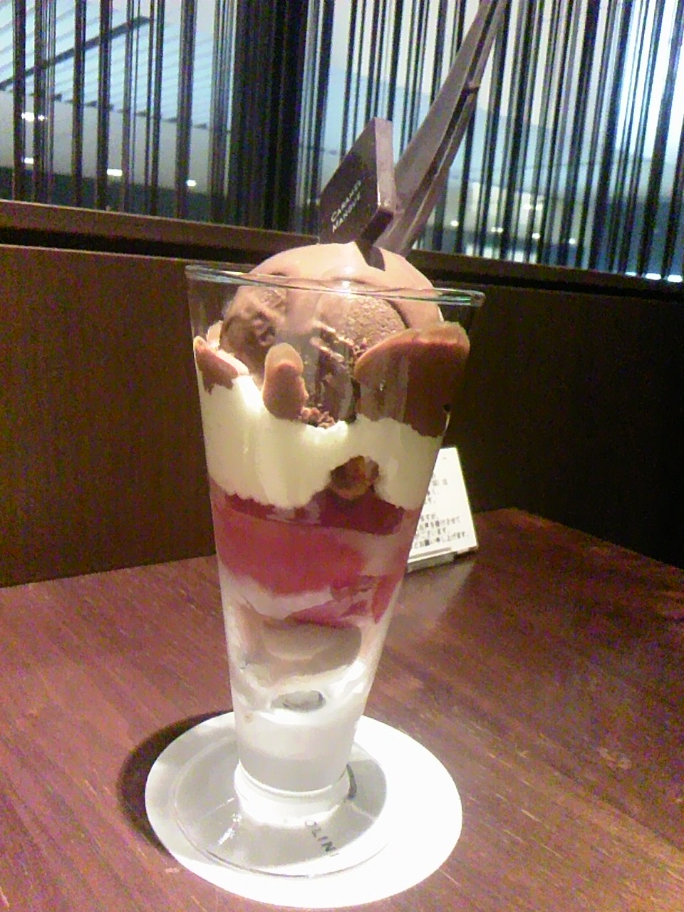 混んでいるという噂の銀座店に行く根性がなく、9月の連休中日 2階にCAFEが併設されている名古屋店でパフェ マリアージュ(濃厚なチョコレートアイスと甘酸っぱく果実実にあふれるフランボワーズソルベのマリアージュ)なるものをいただいてみました。