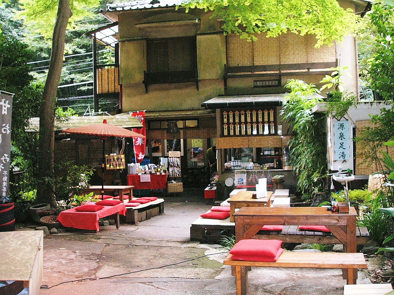滝の入口には不動滝茶屋があり、源泉足湯があります。滝を見て食事をしながら、足湯も楽しむことができます。